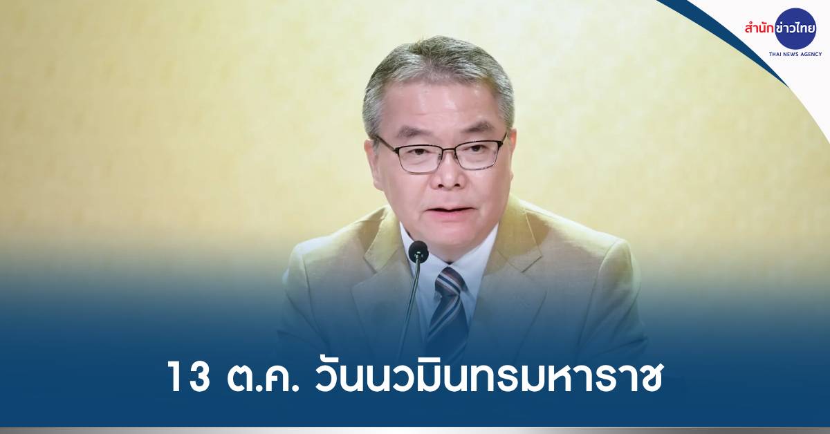 “พระบาทสมเด็จพระเจ้าอยู่หัวทรงพระกรุณาโปรดเกล้าฯ ให้กำหนดชื่อวันคล้ายวันสวรรคตพระบาทสมเด็จพระบรมชนกาธิเบศร มหาภูมิพลอดุลยเดชมหาราช บรมนาถบพิตร ว่า “วันนวมินทรมหาราช” ตามที่รัฐบาลขอพระราชทานพระมหากรุณา จึงเห็นสมควรกำหนดให้วันที่ 13 ตุลาคม ของทุกปี เป็น “วันนวมินทรมหาราช” โฆษกประจำสำนักนายกรัฐมนตรี กล่าว.-สำนักข่าวไทย