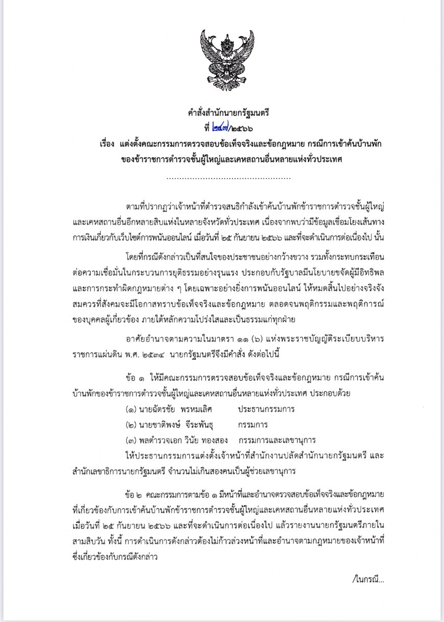 ผู้สื่อข่าวรายงานว่า วานนี้(25 ก.ย.) นายเศรษฐา ทวีสิน นายกรัฐมนตรีและรัฐมนตรีว่าการกระทรวงการคลัง ลงนามในคำสั่งสำนักนายกรัฐมนตรีที่ 247/2566 เรื่องแต่งตั้งคณะกรรมการตรวจสอบข้อเท็จจริงและข้อกฎหมาย กรณีการเข้าค้นบ้านพักของข้าราชการตำรวจชั้นผู้ใหญ่และเคหสถานอื่นหลายแห่งทั่วประเทศ โดยคำสั่งดังกล่าวระบุว่า ตามที่ปรากฎว่าเจ้าหน้าที่ตำรวจสนธิกำลังเข้าค้นบ้านพักข้าราชการตำรวจชั้นผู้ใหญ่ และเคหสถานอื่นอีกหลายสิบแห่งในหลายจังหวัดทั่วประเทศ เนื่องจากพบว่ามีข้อมูลเชื่อมโยงเส้นทางการเงินเกี่ยวกับเว็บไซต์การพนันออนไลน์ เมื่อวันที่ 25 ก.ย.และที่จะดำเนินการต่อเนื่องไป