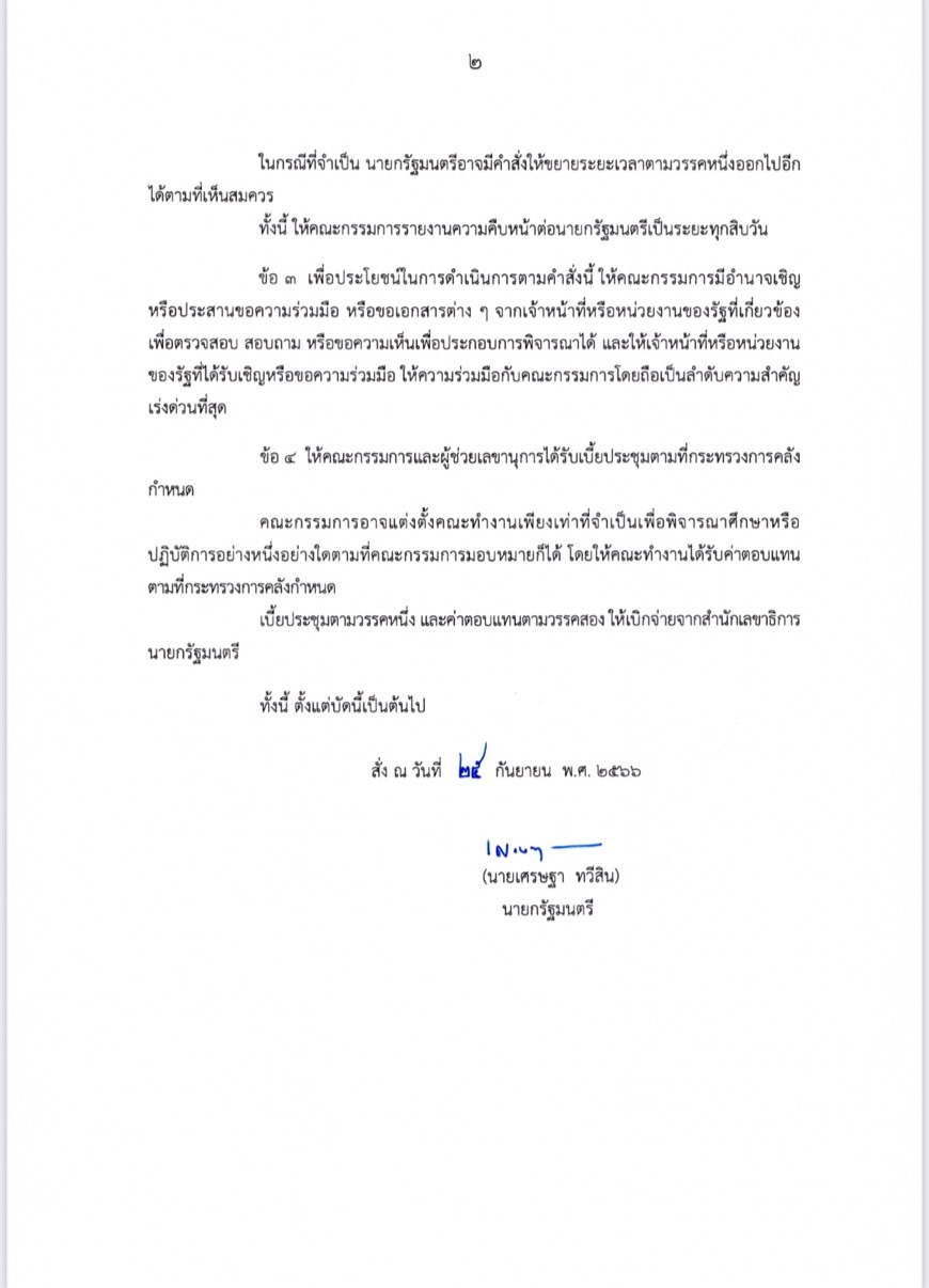 ข้อ 2 คณะกรรมการตามข้อ 1 มีหน้าที่และอำนาจตรวจสอบข้อเท็จจริงและข้อกฎหมายที่เกี่ยวข้องกับการเข้าค้นบ้านพักข้าราชการตำรวจชั้นผู้ใหญ่และเคหสถานอื่นหลายแห่งทั่วประเทศเมื่อวันที่ 25 ก.ย.และที่จะดำเนินการต่อเนื่องไป แล้วรายงานนายกรัฐมนตรีภายใน 30วัน ทั้งนี้ การดำเนินการดังกล่าวต้องไม่ก้าวล่วงหน้าที่และอำนาจตามกฎหมายของเจ้าหน้าที่ซึ่งเกี่ยวข้องกับกรณีดังกล่าวได้ตามที่เห็นสมควร ในกรณีที่จำเป็น นายกรัฐมนตรีอาจมีคำสั่งให้ขยายระยะเวลาตามวรรคหนึ่งออกไปอีก ทั้งนี้ ให้คณะกรรมการรายงานความคืบหน้าต่อนายกรัฐมนตรีเป็นระยะทุก 10 วัน