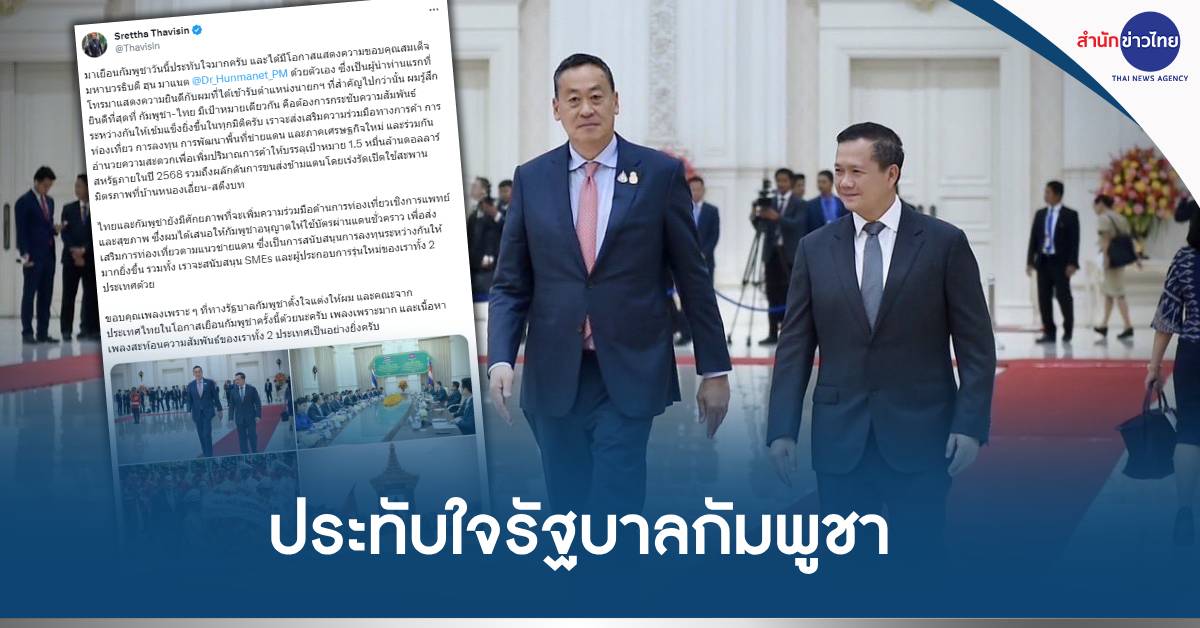 นายเศรษฐา ทวีสิน นายกรัฐมนตรีและรัฐมนตรีว่าการกระทรวงการคลัง โพสต์ข้อความและรูปภาพผ่านทางเอ็กซ์ หรือ ทวิตตอร์เดิม ว่า มาเยือนกัมพูชาวันนี้ประทับใจมากครับ และได้มีโอกาสแสดงความขอบคุณสมเด็จมหาบวรธิบดี ฮุน มาแนต @Dr_Hunmanet_PM ด้วยตัวเอง ซึ่งเป็นผู้นำท่านแรกที่โทรมาแสดงความยินดีกับผมที่ได้เข้ารับตำแหน่งนายกฯ ที่สำคัญไปกว่านั้น ผมรู้สึกยินดีที่สุดที่ กัมพูชา-ไทย มีเป้าหมายเดียวกัน คือต้องการกระชับความสัมพันธ์ระหว่างกันให้เข้มแข็งยิ่งขึ้นในทุกมิติครับ เราจะส่งเสริมความร่วมมือทางการค้า การท่องเที่ยว การลงทุน การพัฒนาพื้นที่ชายแดน และภาคเศรษฐกิจใหม่ และร่วมกันอำนวยความสะดวกเพื่อเพิ่มปริมาณการค้าให้บรรลุเป้าหมาย 1.5 หมื่นล้านดอลลาร์สหรัฐภายในปี 2568 รวมถึงผลักดันการขนส่งข้ามแดนโดยเร่งรัดเปิดใช้สะพานมิตรภาพที่บ้านหนองเอี่ยน-สตึงบท