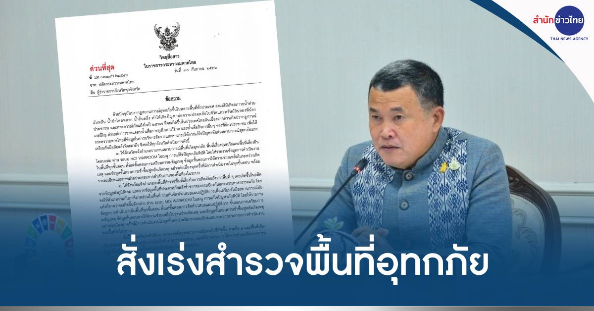 กทม. 30 ก.ย.-ปลัด มท. สั่งการผู้ว่าฯ ทั่วประเทศ กำชับนายอำเภอเร่งสำรวจและรายงานพื้นที่ประสบอุทกภัย เสี่ยงอุทกภัย ดินโคลนถล่ม และภัยแล้ง พร้อมแนวทางช่วยเหลือประชาชน ภายใน 5 ต.ค.66