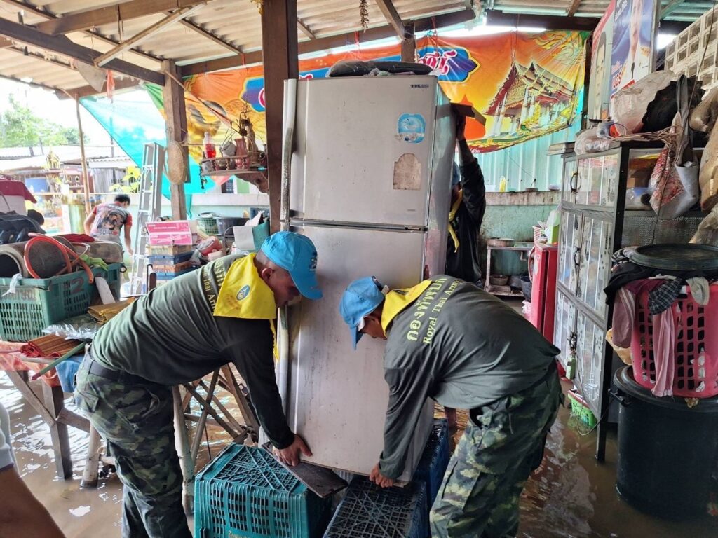 ขณะนี้กองทัพบกได้มีคำสั่งให้ศูนย์บรรเทาสาธารณภัยของกองทัพบกทุกระดับ จัดกำลังพลและยุทโธปกรณ์ เข้าช่วยเหลือประชาชนในพื้นที่ประสบภัยอย่างเร่งด่วน เน้นการบูรณาการร่วมกับส่วนราชการในพื้นที่อย่างใกล้ชิด โดยที่ผ่านมาได้เข้าช่วยเหลือด้วยการอพยพขนย้ายคน สัตว์เลี้ยง และสิ่งของจำเป็นออกจากพื้นที่เพื่อป้องกันความเสียหาย, การก่อกระสอบทรายทำแนวป้องกันน้ำเพื่อป้องกันที่พักอาศัยและพื้นที่เศรษฐกิจ, การอำนวยความสะดวกด้านการสัญจรในเส้นทางที่ได้รับความเสียหายด้วยการใช้รถยนต์บรรทุกทางทหาร และเรือยนต์เข้ารับ-ส่งประชาชนในพื้นที่น้ำท่วมสูง, การสร้างสะพานชั่วคราวโดยหน่วยทหารช่างสนามให้กับประชาชนได้ใช้สัญจรในพื้นที่ ตลอดจนจัดชุดแพทย์เข้ารักษาผู้ประสบอุทกภัย, แจกจ่ายถุงยังชีพ, เครื่องอุปโภคบริโภค และจัดรถครัวสนามบริการอาหารปรุงสุกให้กับประชาชน