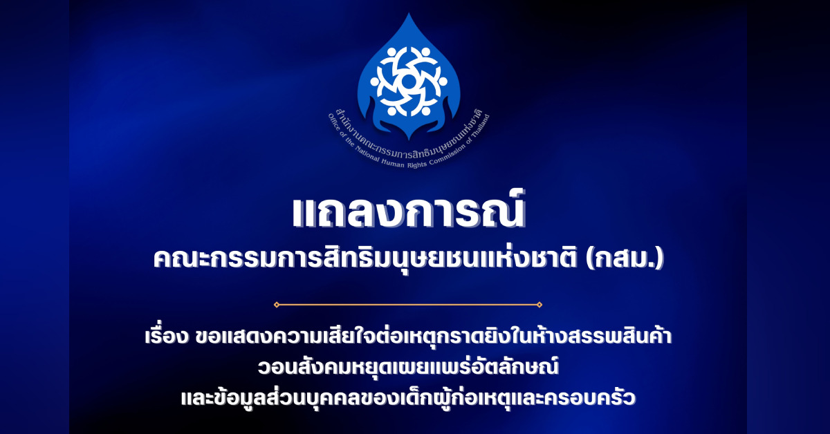 กรุงเทพฯ 4 ต.ค. – กสม. ออกแถลงการณ์ เสียใจเหตุยิงกลางห้างดัง วอนสังคมหยุดเผยแพร่ข้อมูลส่วนบุคคลมือปืน วัย 14 หวั่นสร้างความเกลียดชัง ซ้ำเติมผู้เสียหาย