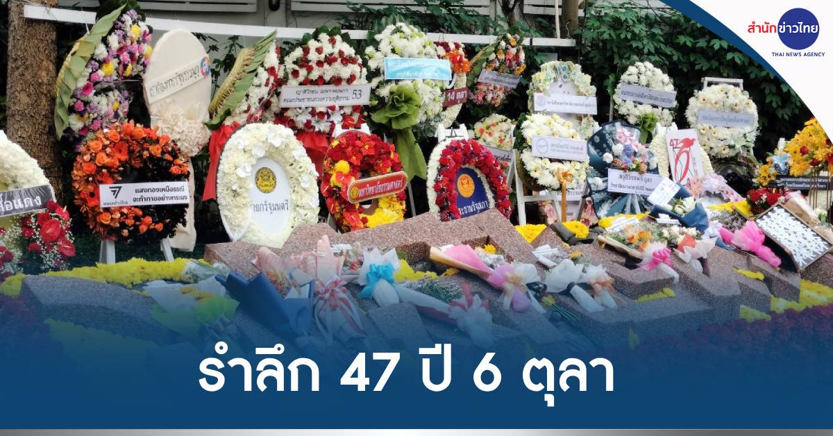 กลุ่มเครือข่ายนักศึกษา 47 ปี 6 ตุลา จัดงานรำลึก 47 ปี 6 ตุลาคม ที่มหาวิทยาลัยธรรมศาสตร์ ท่าพระจันทร์ มีพิธีทำบุญตักบาตรพระสงฆ์ และวางดอกไม้รำลึกวีรชนเดือนตุลาฯ ณ สวนประวัติศาสตร์ธรรมศาสตร์กับการต่อสู้เพื่อประชาธิปไตย โดยมีนักการเมืองทั้งฝ่ายรัฐบาลและฝ่ายค้านต่างมาร่วมกิจกรรม เช่น นายชูศักดิ์ ศิรินิล สส.บัญชีรายชื่อ พรรคเพื่อไทย นายชัยธวัช ตุลาธน หัวหน้าพรรคก้าวไกล นายพิธา ลิ้มเจริญรัตน์ อดีตหัวหน้าพรรค และสส.พรรคก้าวไกล น.ต.ศิธา ทิวารี พรรคไทยสร้างไทย หลังจากนี้จะมีการกล่าวปาฐกถาพิเศษรำลึก 47 ปี 6 ตุลาฯ หัวข้อ “แด่ทุกต้นกล้าความฝัน: ตื่นจากฝันร้ายของอำนาจนิยมและทุนผูกขาดสู่รัฐสวัสดิการ” รวมถึงกิจกรรมฉายภาพยนตร์สารคดี 6 ตุลาฯ “ต่างความคิด ผิดถึงตาย” ณ หอประชุมศรีบูรพา.-สำนักข่าวไทย