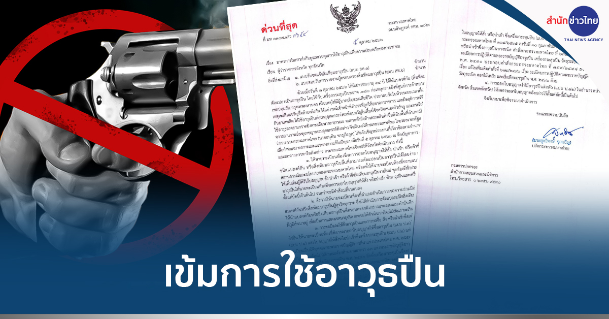 กระทรวงมหาดไทย 6 ต.ค.- “ปลัดมหาดไทย” ลงนามหนังสือด่วนที่สุด ถึงผู้ว่าฯ ทุกจังหวัด เข้มการใช้อาวุธปืนตามนโยบายรัฐบาล งดออกใบอนุญาต ขึ้นทะเบียนแบลงค์กันหรืออาวุธเทียม กวดขันสมาคมยิงปืน ไม่ให้มีอาวุธปืนติดตัว