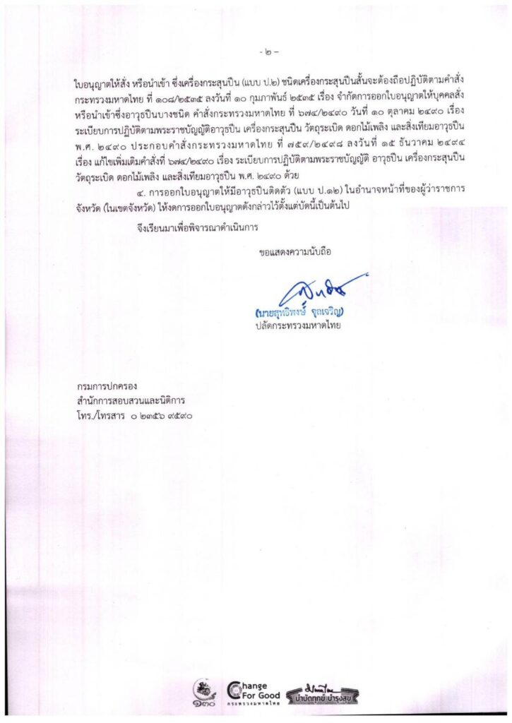 - ให้นายทะเบียนท้องที่งดการออกใบอนุญาตให้สั่ง นำเข้า หรือค้าซึ่งสิ่งเทียมอาวุธปืนชนิดแบลงค์กัน หรือสิ่งเทียมอาวุธปืนอื่นที่สามารถดัดแปลงเป็นอาวุธปืนได้โดยง่าย เพื่อให้สอดคล้องกับสถานการณ์และนโยบายของกระทรวงมหาดไทย พร้อมทั้งให้นายทะเบียนท้องที่ทราบแนวทางที่จะไม่มีนโยบายให้เพิ่มเติมผู้ได้รับใบอนุญาต สั่ง นำเข้า หรือค้าซึ่งสิ่งเทียมอาวุธปืนรายใหม่ ทุกท้องที่ทั่วประเทศ สำหรับกรณีร้านค้าอาวุธปืนให้นายทะเบียนท้องที่งดการออกใบอนุญาตให้สั่ง หรือนำเข้า ซึ่งอาวุธปืนและเครื่องกระสุนปืน (แบบ ป.2) ตั้งแต่บัดนี้เป็นต้นไป จนกว่าจะมีคำสั่งเปลี่ยนแปลง