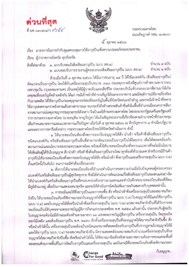 นายสุทธิพงษ์ จุลเจริญ ปลัดกระทรวงมหาดไทย (มท.)ลงนามหนังสือด่วนที่สุด ที่ มท 0307.4/ว3654 วันที่ 5 ต.ค. เรื่อง มาตรการในการกำกับดูแลควบคุมการใช้อาวุธปืนเพื่อความปลอดภัยของประชาชน ถึงผู้ว่าราชการจังหวัดทุกจังหวัด ระบุว่า ด้วยเมื่อวันที่ 3 ต.ค. 66 ได้มีเยาวชนอายุ 14 ปี ได้ใช้แบลงค์กัน (สิ่งเทียมอาวุธปืน) ดัดแปลงเป็นอาวุธปืน โดยใช้กับเครื่องกระสุนปืนขนาด .380 ก่อเหตุกราดยิงที่ศูนย์การค้าสยามพารากอน เขตปทุมวัน กรุงเทพมหานคร เป็นเหตุให้มีผู้บาดเจ็บและเสียชีวิต ประกอบกับในห้วงระยะเวลาที่ผ่านมาได้เกิดเหตุสะเทือนขวัญที่คล้ายคลึงกัน ได้แก่ กรณีเจ้าหน้าที่ตำรวจที่ถูกให้ออกจากราชการ และมีพฤติการณ์ที่อาจเกี่ยวข้องกับยาเสพติดได้ใช้อาวุธปืนก่อเหตุอุกฉกรรจ์สะเทือนขวัญในพื้นที่จ.หนองบัวลำภู และกรณีเจ้าหน้าที่ทหารใช้อาวุธสงครามกราดยิงตามเส้นทางสาธารณะ จนกระทั่งถึงห้างสรรพสินค้าชื่อดังในพื้นที่อ.เมืองนครราชสีมา จากสถานการณ์เหตุอาชญากรรมอุกฉกรรจ์ดังกล่าว จึงเป็นผลให้กระทรวงมหาดไทย โดยนายอนุทิน ชาญวีรกูล รองนายกรัฐมนตรีและรมว.มหาดไทย ได้แจ้งเชิญหน่วยงานที่เกี่ยวข้องตามอำนาจหน้าที่ร่วมประชุมเพื่อกำหนดมาตรการและแนวทางการแก้ไขปัญหา เมื่อวันที่ 5 ต.ค. 66 ณ ตึกบัญชาการ 1 ทำเนียบรัฐบาล และผลจากการหารือดังกล่าว กระทรวงมหาดไทยจึงขอให้จังหวัดดำเนินการ