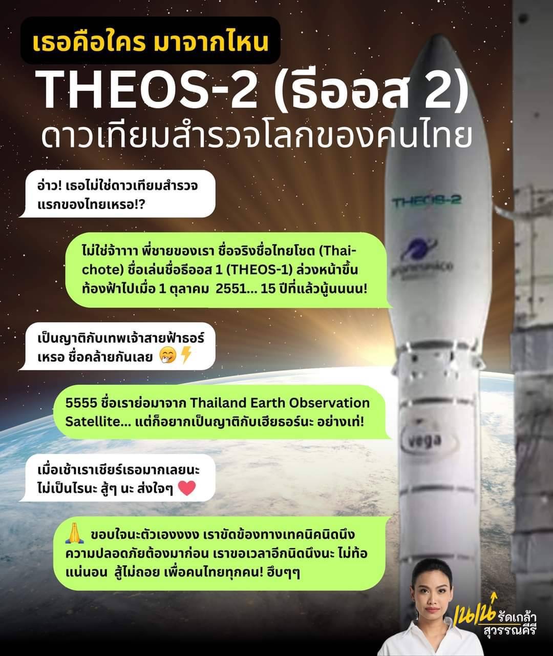 นางรัดเกล้า อินทวงศ์ สุวรรณคีรี รองโฆษกประจำสำนักนายกรัฐมนตรี เปิดเผยว่า ดาวเทียม THEOS-2 เป็นดาวเทียมสำรวจโลกดวงใหม่ของประเทศไทย และเป็นครั้งแรกที่ไทยจะส่งดาวเทียมที่สามารถบันทึกภาพที่มีความละเอียดระดับสูงมากขึ้นสู่อวกาศ เพื่อนำมาสนับสนุนการพัฒนาประเทศ เป็นเหตุการณ์สำคัญ เพื่อความก้าวหน้าทางเทคโนโลยี นวัตกรรม และทั้งหมดก็เพื่อชีวิตความเป็นอยู่ที่ดีขึ้นของพี่น้องประชาชน โดยขอเชิญชวนชาวไทยทุกคนร่วมส่งกำลังใจกับภารกิจส่งดาวเทียม THEOS-2 (ธีออส-2) ขึ้นสู่วงโคจร เชื่อมั่นนักวิทยาศาสตร์ไทยเก่งไม่แพ้ชาติใดในโลก