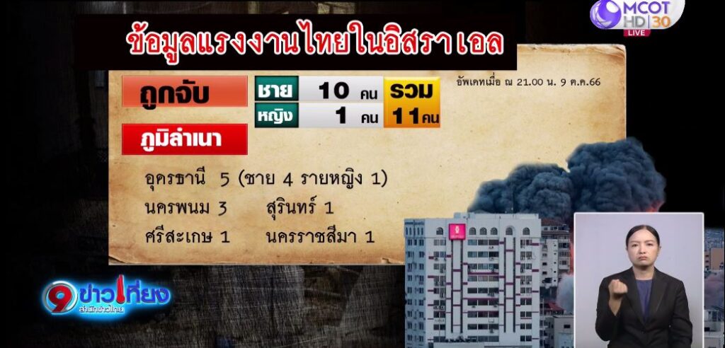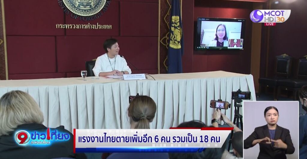 ด้านโฆษกกระทรวงการต่างประเทศ แถลงรับแจ้งจากนายจ้างแรงงานไทย ในอิสราเอล เสียชีวิตเพิ่มอีก 6 ราย เป็น 18 ราย บาดเจ็บเพิ่มอีก 1 ราย เป็น 9 ราย ล่าสุด มีแรงงานไทยติดต่อขอกลับเพิ่มเป็น 3,226 คน