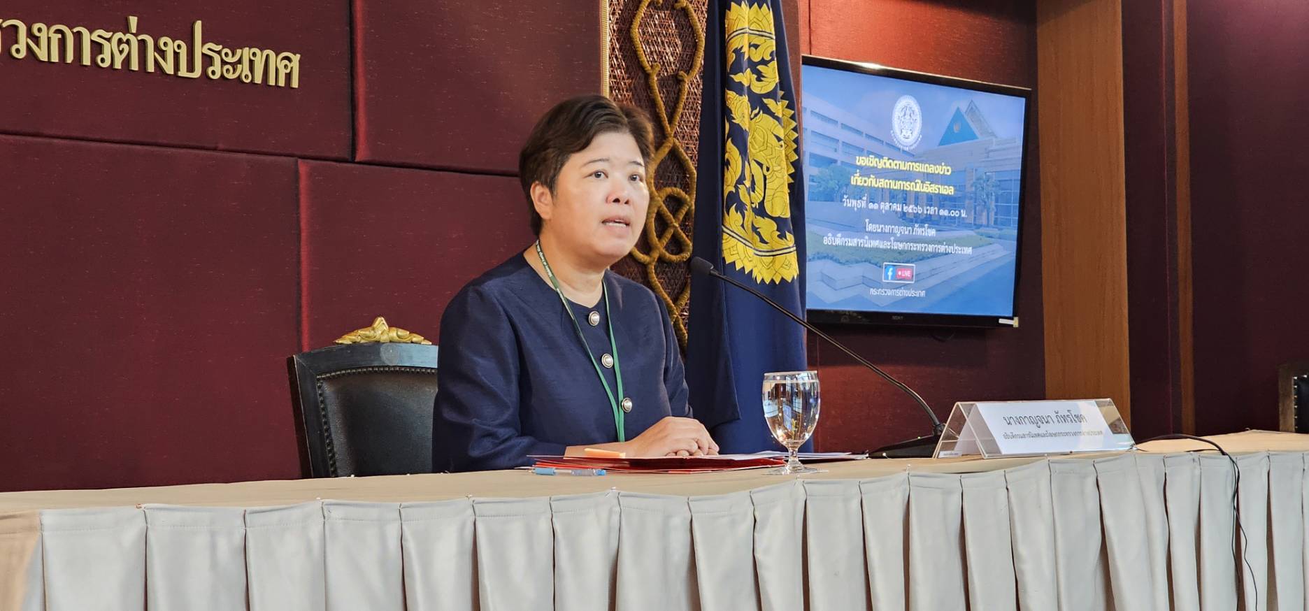 นางกาญจนา ภัทรโชค อธิบดีกรมสารนิเทศและโฆษกกระทรวงการต่างประเทศ แถลงความคืบหน้าสถานการณ์ฉุกเฉินในอิสราเอล ว่า ยังคงมีการโจมตีด้วยจรวดที่ฉนวนกาซ่า มีการสูญเสียจากทั้งสองฝ่าย ทั้งพลเรือน และทหาร ทางฝ่ายอิสราเอลพยายามเข้าครอบครองยึดคืนพื้นที่คืนและเร่งซ่อมแซม แต่ยังคงมีผู้ก่อการที่หลบซ่อนอยู่ในอิสราเอล ในแง่ผลกระทบต่อคนไทยในพื้นที่ ต้องขอแสดงความเสียใจ