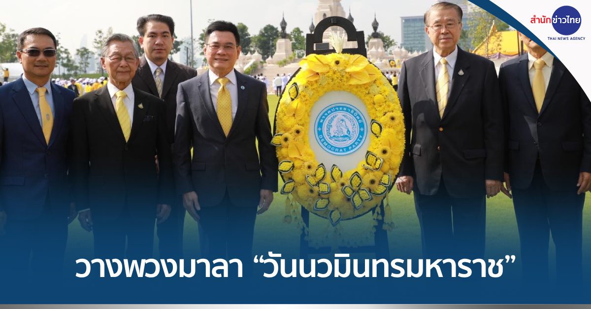 นายจุรินทร์ ลักษณวิศิษฏ์ รักษาการหัวหน้าพรรคประชาธิปัตย์ ประกอบด้วย นายชวน หลีกภัย นายบัญญัติ บรรทัดฐาน นายองอาจ คล้ามไพบูลย์ ดร.สามารถ ราชพลสิทธิ์ นายสาธิต ปิตุเตชะ นายนราพัฒน์ แก้วทอง น.ส.ผ่องศรี ธาราภูมิ พร้อมด้วยตัวแทนพรรคประชาธิปัตย์ สาขาพรรค และสมาชิกพรรค วางพวงมาลา เนื่องใน “วันนวมินทรมหาราช” ณ พระบรมราชานุสาวรีย์ ร.9 .-สำนักข่าวไทย