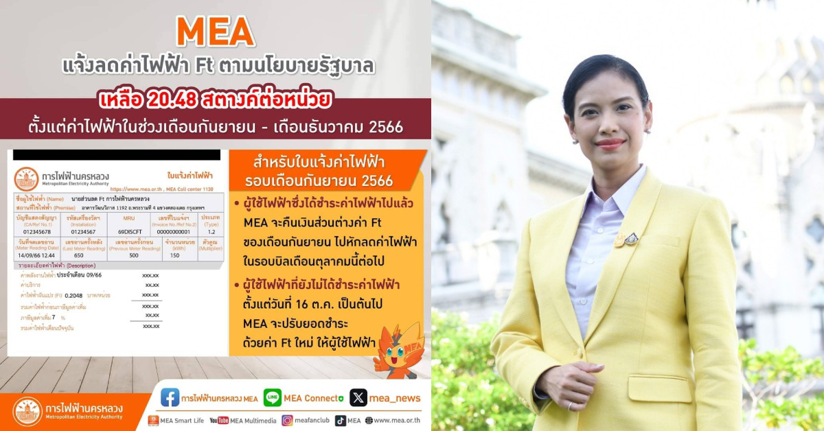 - ผู้ใช้ไฟฟ้าซึ่งได้ชำระค่าไฟฟ้าไปแล้ว MEA จะคืนเงินส่วนต่างค่า Ft ของเดือนกันยายน ไปหักลดค่าไฟฟ้าในรอบบิลเดือนตุลาคมนี้ต่อไป