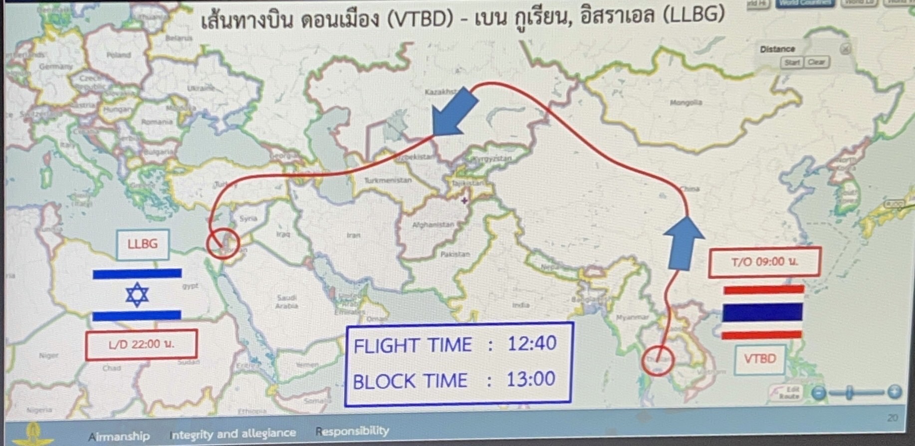 สำหรับเส้นทางการบิน Airbus 340-500 กองทัพอากาศ จะบินผ่านน่านฟ้า 10 ประเทศ (เส้นทางบินเดิม) ได้แก่ สาธารณรัฐประชาธิปไตยประชาชนลาว สาธารณรัฐประชาชนจีน คาซัคสถาน อุซเบกิสถาน เติร์กเมนิสถาน อาเซอร์ไบจาน อาร์มิเนีย ตุรกี ไซปรัส และอิสราเอล โดยมีกำลังพลกองทัพอากาศ ประกอบด้วย นักบิน ลูกเรือ เจ้าหน้าที่อำนวยการ เจ้าหน้าที่รักษาความปลอดภัย และทีมแพทย์ รวมถึงเจ้าหน้าที่จากกระทรวงการต่างประเทศ และกระทรวงแรงงาน ที่ร่วมเดินทางเพื่อให้การช่วยเหลือและอำนวยความสะดวกแก่คนไทย ทั้งนี้ เที่ยวบินเที่ยวที่ 2 มีกำหนดเดินทางกลับถึงท่าอากาศยานทหาร 2 กองบิน 6 ในวันพรุ่งนี้ (19 ต.ค.) เวลา 13.40 น.-สำนักข่าวไทย
