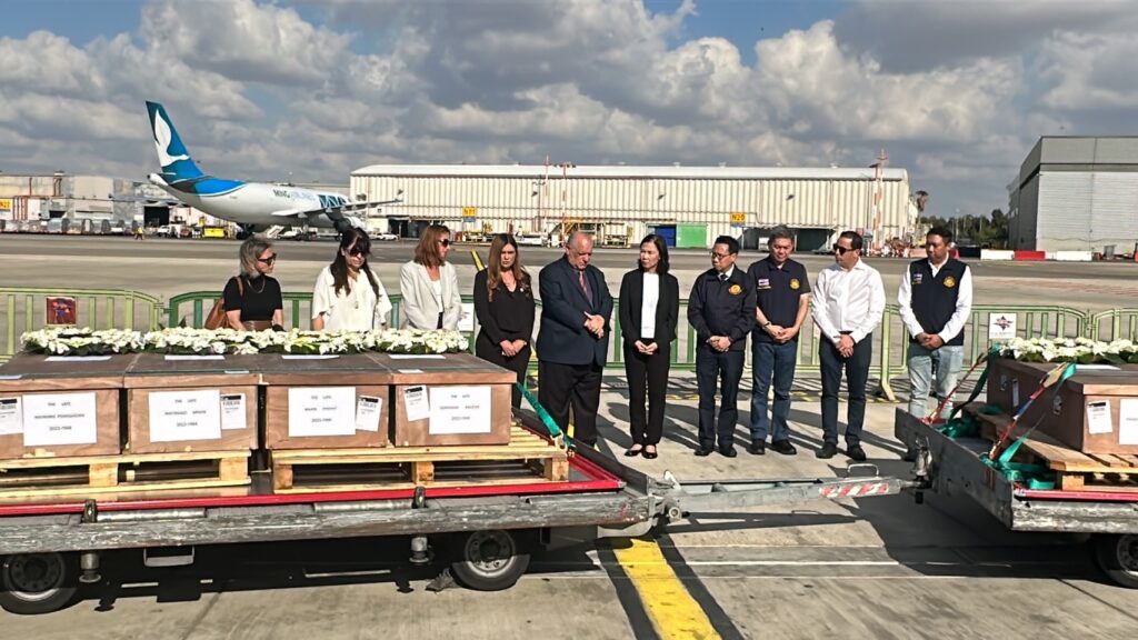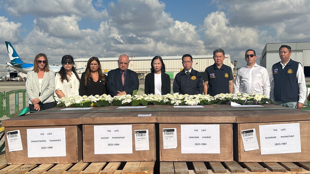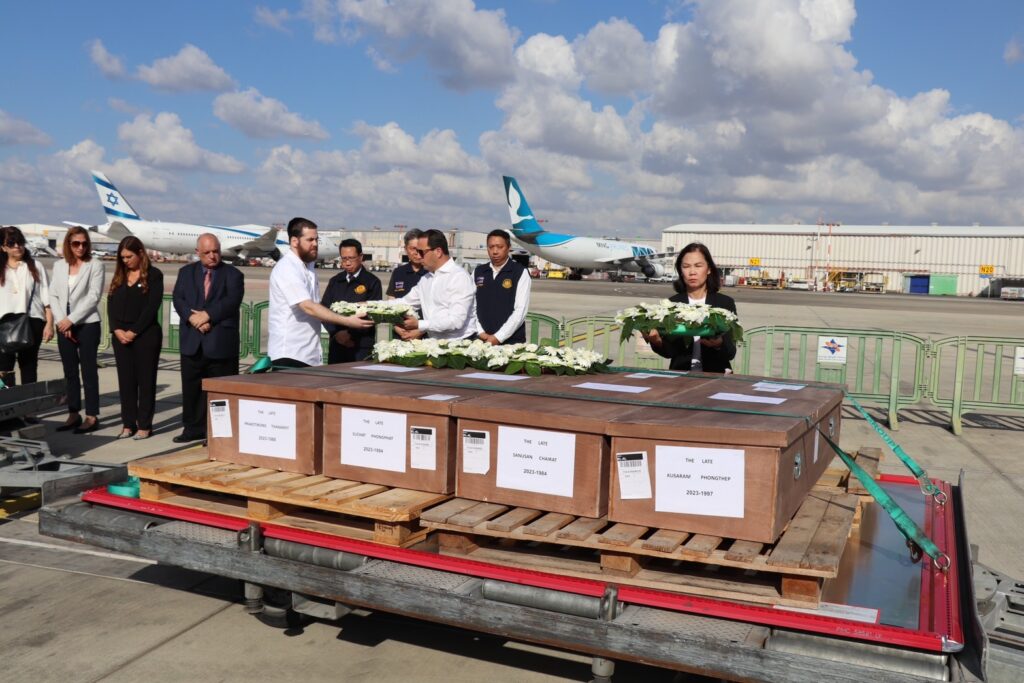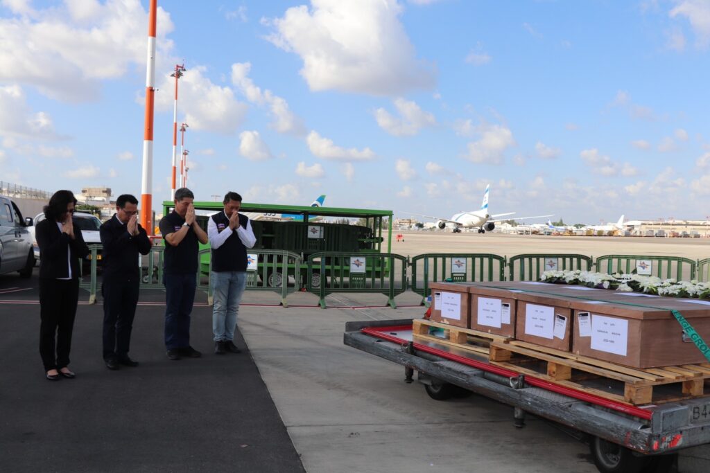 อิสราเอล 20 ต.ค.-เอกอัครราชทูตไทย ณ กรุงเทลอาวีฟ นำทำพิธีไว้อาลัยและส่งศพแรงงานไทย 8 ราย ที่เสียชีวิตจากเหตุการณ์สงครามในอิสราเอล เพื่อกลับสู่ประเทศไทย