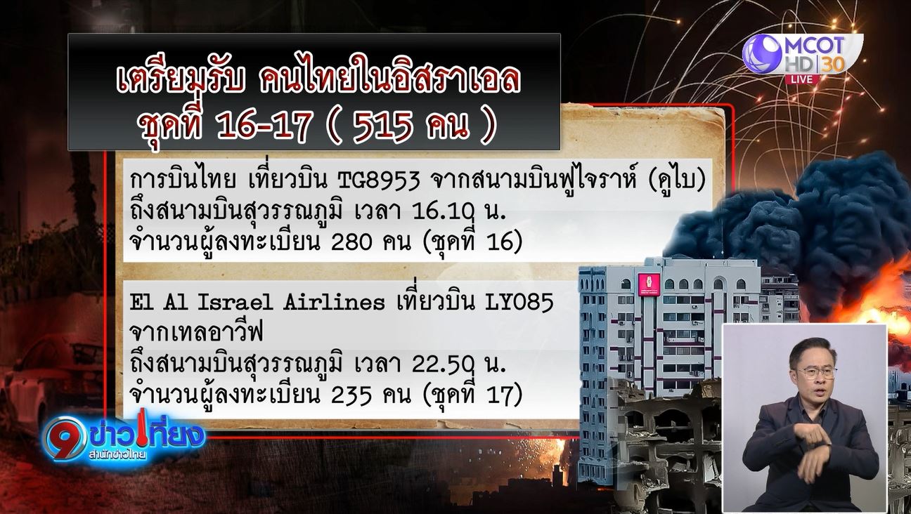 กรุงเทพฯ 23 ต.ค. – กระทรวงการต่างประเทศ แจ้งรายละเอียดเที่ยวบินอพยพคนไทยในอิสราเอลที่จะกลับถึงไทยในวันนี้ อีกกว่า 500 คน