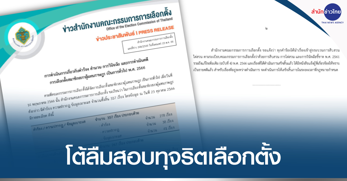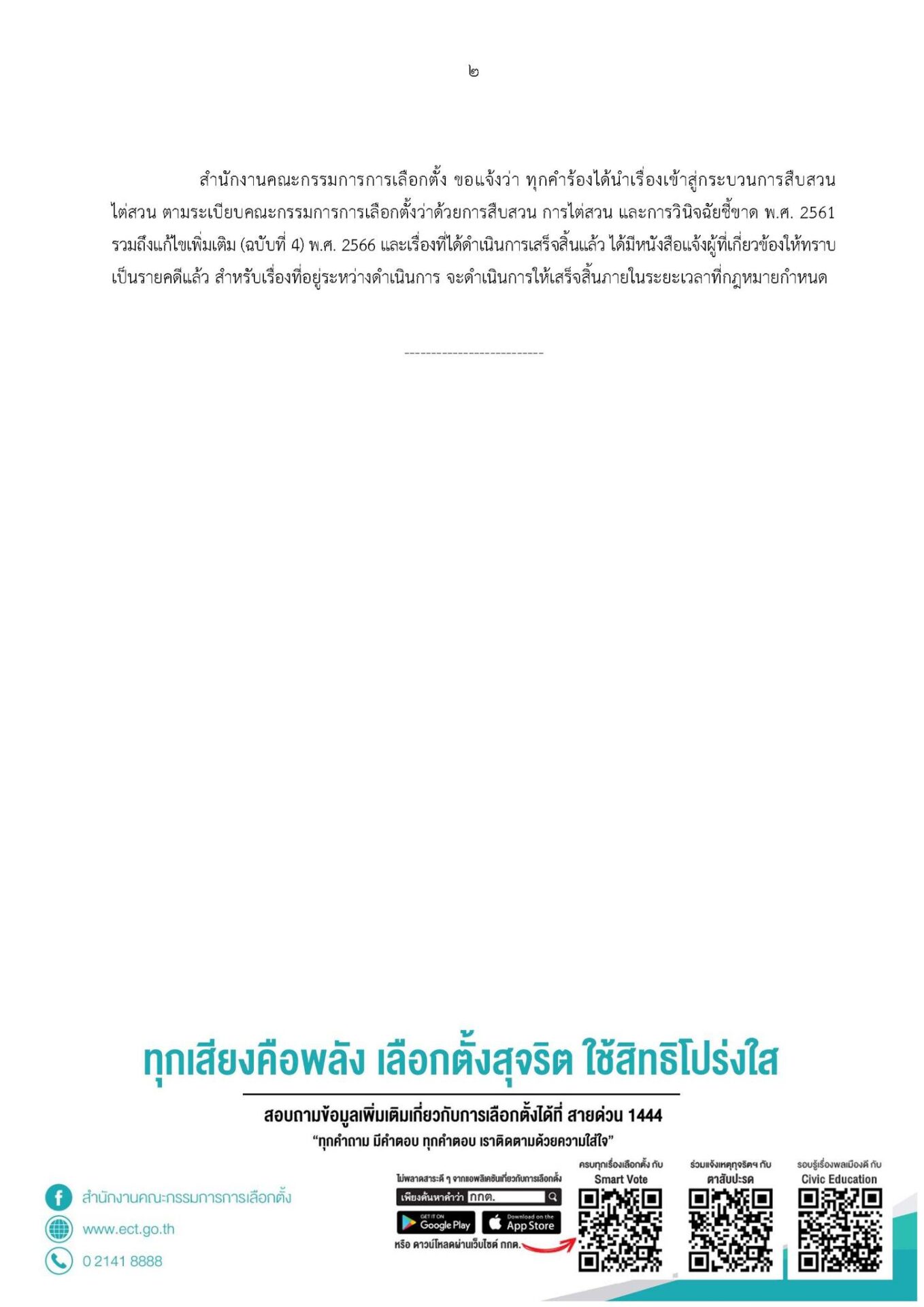 สำนักงาน กกต. ขอแจ้งว่า ทุกคำร้องได้นำเรื่องเข้าสู่กระบวนการสืบสวนไต่สวน ตามระเบียบคณะกรรมการการเลือกตั้งว่าด้วยการสืบสวน การไต่สวน และการวินิจฉัยชี้ขาด พ.ศ. 2561 รวมถึงแก้ไขเพิ่มเติม (ฉบับที่ 4) พ.ศ. 2566 และเรื่องที่ได้ดำเนินการเสร็จสิ้นแล้ว ได้มีหนังสือแจ้งผู้ที่เกี่ยวข้องให้ทราบเป็นรายคดีแล้ว สำหรับเรื่องที่อยู่ระหว่างดำเนินการ จะดำเนินการให้เสร็จสิ้นภายในระยะเวลาที่กฎหมายกำหนด. – สำนักข่าวไทย