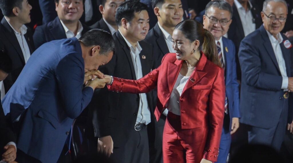 สำหรับภาพที่ปรากฏของนายเศรษฐาจูบมือนางสาวแพทองธาร ตามธรรมเนียมต่างชาติ หลังได้รับตำแหน่งหัวหน้าพรรคเพื่อไทยเป็นการส่งสัญญาณหรือส่งไม้ต่ออะไรหรือไม่ นายภูมิธรรม กล่าวว่า แล้วแต่จะตีความ แต่ส่วนตัวมองว่าเป็นการแสดงความชื่นชม และเคารพซึ่งกันและกัน ยืนยันไม่ได้มีนัยอะไร