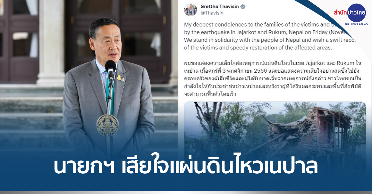 “นายกรัฐมนตรีเสียใจต่อเหตุการณ์แผ่นดินไหวในเขตพื้นที่ภาคตะวันตกของเนปาล เมื่อกลางดึกคืนวันที่ 3 พฤศจิกายน 2566 ให้กำลังใจรัฐบาลและประชาชนชาวเนปาลในเหตุการณ์ครั้งนี้” นายชัย กล่าว .-สำนักข่าวไทย