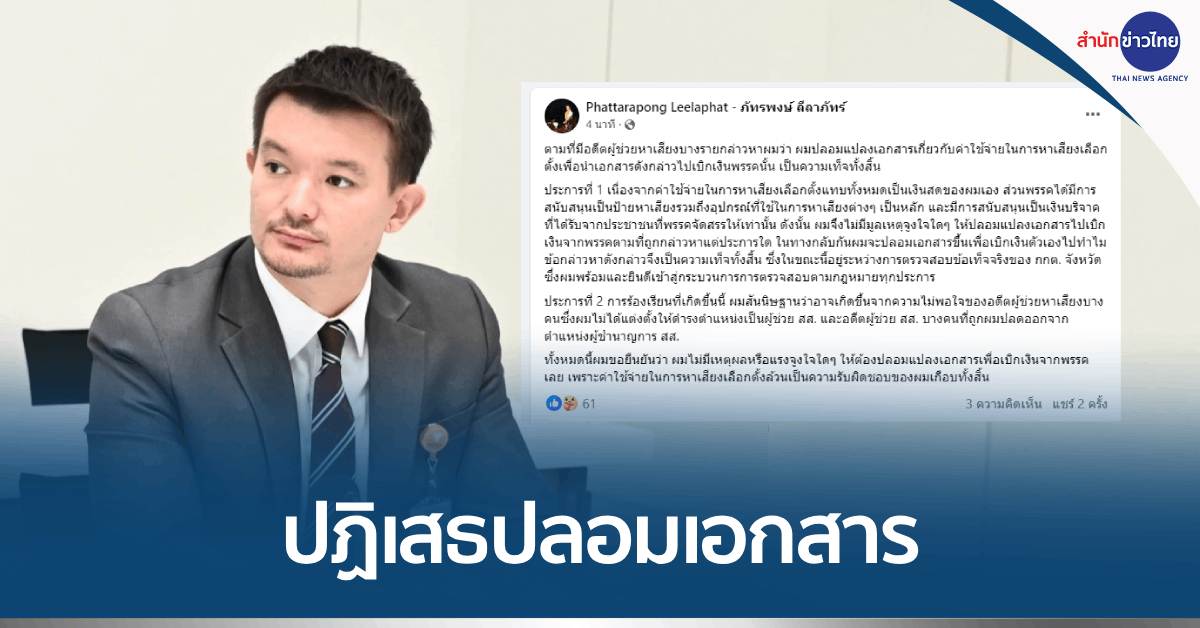 นายภัทรพงษ์ ลีลาภัทร์ สส. เขต 8 จังหวัดเชียงใหม่ โพสต์ Facebook ว่า ตามที่มีอดีตผู้ช่วยหาเสียงบางรายกล่าวหาผมว่า ผมปลอมแปลงเอกสารเกี่ยวกับค่าใช้จ่ายในการหาเสียงเลือกตั้งเพื่อนำเอกสารดังกล่าวไปเบิกเงินพรรคนั้น เป็นความเท็จทั้งสิ้น