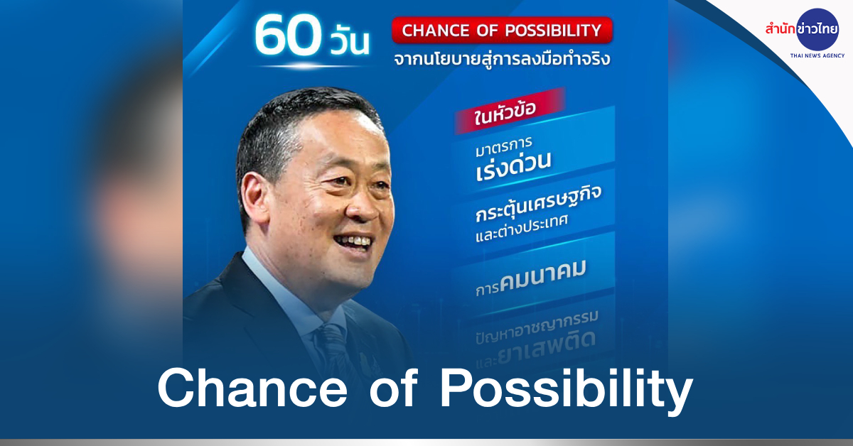 ทำเนียบฯ 9 พ.ย.- “เศรษฐา” โพสต์ชวนติดตามรายการพิเศษ “Chance of Possibility จากนโยบายสู่การลงมือทำจริง 60 วัน ภายใต้รัฐบาลนายกฯ เศรษฐา ทวีสิน” คืนนี้