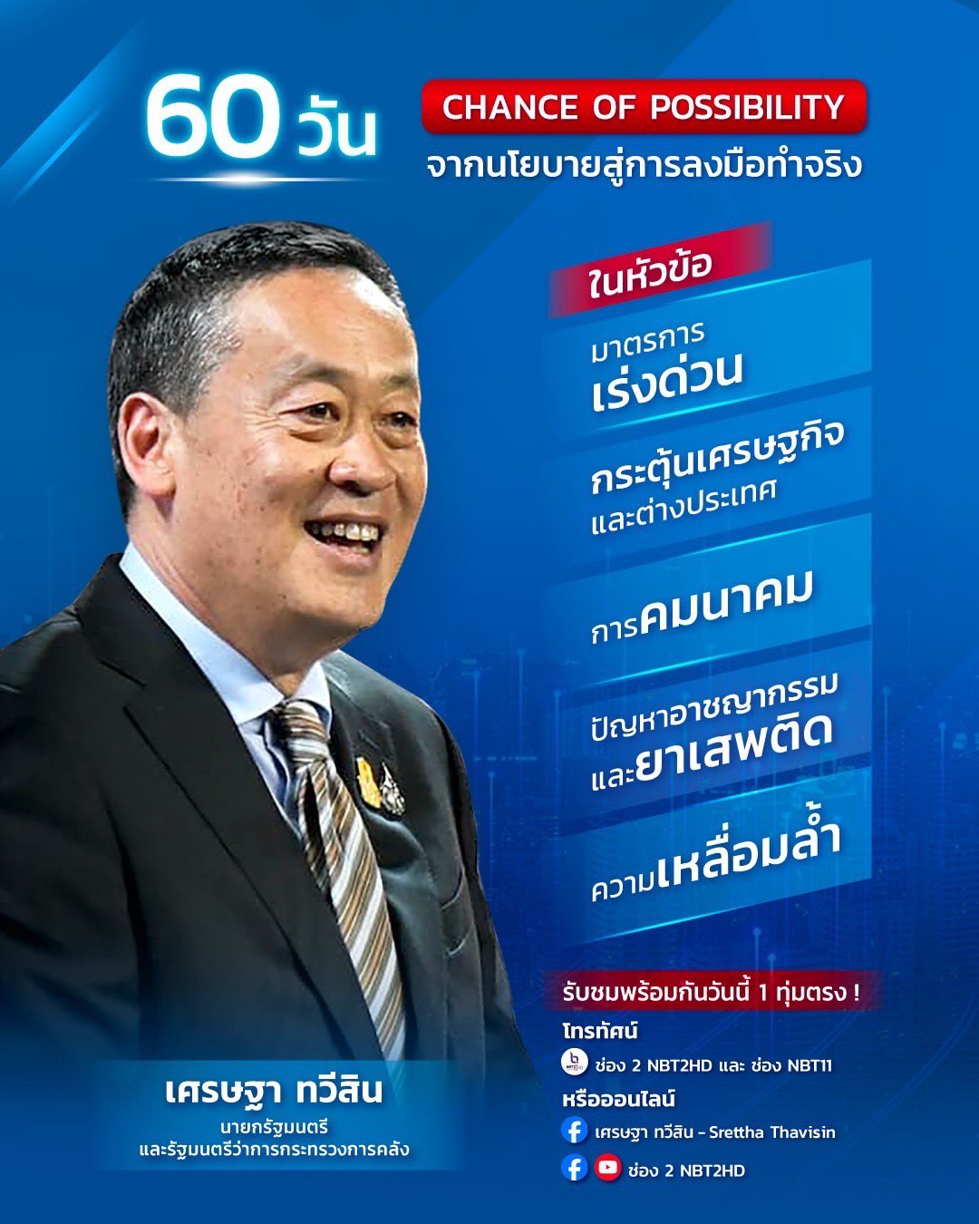 นายเศรษฐา ทวีสิน นายกรัฐมนตรีและรัฐมนตรีว่าการกระทรวงการคลัง โพสต์ข้อความผ่าน X (ทวิตเตอร์เดิม) ระบุว่า สำหรับวันนี้ในรายการพิเศษ “Chance of Possibility จากนโยบายสู่การลงมือทำจริง 60 วัน ภายใต้รัฐบาลนายกฯ เศรษฐา ทวีสิน” ผมอยากแชร์ความคืบหน้าในหัวข้อต่าง ๆ ของนโยบายรัฐบาล เช่น Quick win 3 ประการ คือ ลดค่าใช้จ่าย เพิ่มรายได้ และขยายโอกาส ซึ่งรวมไปถึงกระตุ้นเศรษฐกิจครั้งใหญ่ ทั้งการต่างประเทศ การคมนาคม ปัญหาสังคม อาชญากรรม ยาเสพติด เพื่อลดความเหลื่อมล้ำ และยกระดับชีวิตของพี่น้องประชาชนให้ดียิ่งขึ้น สามารถติดตามได้ทางช่อง NBT2HD, NBT11 และทางออนไลน์ Facebook, YouTube ของทั้ง 2 ช่อง รวมถึง Facebook เศรษฐา ทวีสิน – Srettha Thavisin ของผมด้วยครับ.-สำนักข่าวไทย