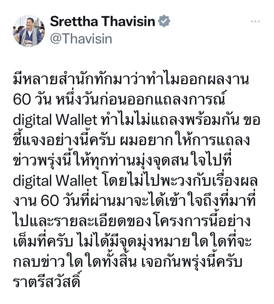 นายเศรษฐา ทวีสิน นายกรัฐมนตรีและรัฐมนตรีว่าการกระทรวงการคลัง ทวีตข้อความผ่าน X ว่า “มีหลายสำนักทักมาว่าทำไมออกผลงาน 60 วัน หนึ่งวันก่อนออกแถลงการณ์ Digital wallet ทำไมไม่แถลงพร้อมกัน ขอชี้แจงอย่างนี้ครับ ผมอยากให้การแถลงข่าวพรุ่งนี้ให้ทุกท่านมุ่งจุดสนใจไปที่ Digital wallet โดยไม่ไปพะวงกับเรื่องผลงาน 60 วันที่ผ่านมา จะได้เข้าใจถึงที่มาที่ไปและรายละเอียดของโครงการนี้อย่างเต็มที่ครับ ไม่ได้มีจุดมุ่งหมายใดใดที่จะกลบข่าวใดใดทั้งสิ้น เจอกันพรุ่งนี้ครับ ราตรีสวัสดิ์” .-สำนักข่าวไทย
