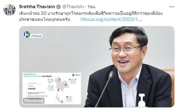 ผู้สื่อข่าวรายงานว่า นายเศรษฐา ได้แนบลิงก์บทสัมภาษณ์ของ นพ.สุรพงษ์ สืบวงศ์ลี ในฐานะเลขานุการคณะกรรมการพัฒนาระบบสุขภาพแห่งชาติ ถึงความคืบหน้าการใช้บัตรประชาชนใบเดียวรักษาสุขภาพทุกเครือข่าย ซึ่งต่อยอดนโยบาย 30 บาท ของพรรคเพื่อไทย ซึ่งชี้ให้เห็นว่า โครงการดังกล่าวมีความคืบหน้า 80% โดยนำร่องรักษา 4 จังหวัด และภายในปี 2567 จะสมบูรณ์ทั้งระบบ คาดว่าในอนาคตเตรียมพร้อมรับ 2 สิทธิ์ คือ ข้าราชการและประกันสังคม