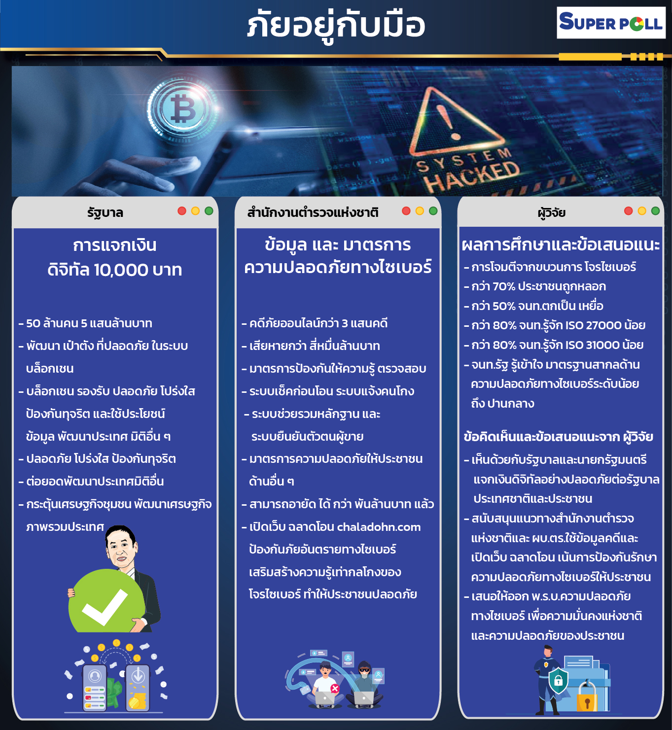 ผศ.ดร.นพดล กรรณิกา ผู้ก่อตั้งสำนักวิจัยซูเปอร์โพล (Super Poll) และศิษย์เก่ามหาวิทยาลัยจอร์จทาวน์ วอชิงตัน ดีซี สหรัฐอเมริกา ด้านความปลอดภัยทางไซเบอร์ กล่าวในฐานะผู้แทนภาคประชาชนในกรรมการผู้ทรงคุณวุฒินโยบายตำรวจแห่งชาติ (ก.ต.ช.) เปิดเผยผลการศึกษาเรื่อง “ภัยอยู่กับมือ” เป็นการวิเคราะห์ข้อมูลจากผลสำรวจและแหล่งอื่นๆ เกี่ยวกับความปลอดภัยทางไซเบอร์ พบว่า ประชาชนส่วนใหญ่หรือร้อยละ 76.0 เคยถูกหลอกลวงในโลกออนไลน์จากการใช้โซเชียล และแม้แต่เจ้าหน้าที่รัฐด้านความปลอดภัยทางไซเบอร์เกินครึ่ง หรือร้อยละ 51.2 เคยตกเป็นเหยื่อขบวนการมิจฉาชีพในโลกออนไลน์หลายรูปแบบ เช่น ลิงก์ล่อเหยื่อ เข้าใช้บริการระบบออนไลน์ไม่ได้ การถูกดูดเงินออกไปจากบัญชี และอื่นๆ ปัญหาอันตรายเหล่านี้คือ “ภัยอยู่กับมือ” ของประชานทุกคน การที่รัฐบาลจะแจกเงินดิจิทัล 10,000 บาท ให้ประชาชนกว่า 50 ล้านคนทั่วประเทศ รวมเป็นเงินกว่า 5 แสนล้านบาท จึงกลายเป็นบ่อน้ำมันทรัพยากรอันมีค่ามหาศาล ล่อตาล่อใจให้ขบวนการ “โจรไซเบอร์” กล้าลงทุนเข้ามาโจมตีระบบความปลอดภัยทางไซเบอร์ของรัฐบาล และที่โจมตีง่ายที่สุดคือ โทรศัพท์มือถือของประชาชน จึงกลายเป็นภัยอยู่กับมือ ที่รัฐบาลและหน่วยงานความมั่นคงของชาติจะนิ่งนอนใจต่อไปไม่ได้ เพราะการโจมตีทางไซเบอร์ไปยังมือถือของประชาชนกำลังเป็นปัญหาใหญ่อยู่ทั่วโลกในเวลานี้