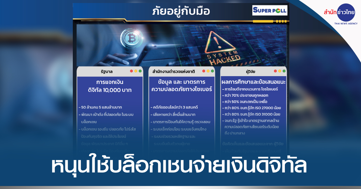 กรุงเทพฯ 12 พ.ย. – “ซูเปอร์โพล” เผยผลสำรวจ “ภัยอยู่กับมือ” พบประชาชน-จนท.รัฐเคยตกเป็นเหยื่อมิจฉาชีพบนโลกออนไลน์ หนุนรัฐบาลใช้ระบบบล็อกเชน “จ่ายเงินดิจิทัลวอลเล็ต” ชี้มีความโปร่งใส-ปลอดภัยสูง ป้องกันการขโมยข้อมูลจากโจรไซเบอร์