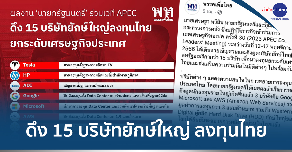 ผู้สื่อข่าวรายงานว่า เพจพรรคเพื่อไทย โพสต์ระบุนายเศรษฐา ทวีสิน นายกรัฐมนตรีและรัฐมนตรีว่าการกระทรวงการคลัง ซึ่งปฏิบัติภารกิจเข้าร่วมการประชุมผู้นำเขตเศรษฐกิจเอเปค ครั้งที่ 30 ระหว่างวันที่ 12-17 พฤศจิกายน 2566 ได้เดินสายเชิญชวนและดึงดูดบริษัทยักษ์ใหญ่ของสหรัฐอเมริกากว่า 15 บริษัท เพื่อมาลงทุนยกระดับเศรษฐกิจไทยและส่งเสริมความร่วมมือในมิติต่างๆ ไปพร้อมกัน ซึ่งบริษัทต่าง ๆ แสดงความสนใจในการขยายการลงทุนในประเทศไทย โดยนายกรัฐมนตรีได้เผยผลสำเร็จการเจรจาดึงดูดนักลงทุนรายใหญ่เกิดขึ้นแล้ว 3 บริษัท คือ Google, Microsoft และ AWS (Amazon Web Services) รวมมูลค่าการลงทุนกว่า 3 แสนล้านบาท รวมถึง Western Digital ผู้ผลิต Hard Disk Drive (HDD) ยักษ์ใหญ่ของโลก ได้ยืนยันจะขยายการผลิตชิ้นส่วนในไทยแล้ว สำหรับ 15 บริษัทที่นายกรัฐมนตรีได้พบหารือ ได้แก่