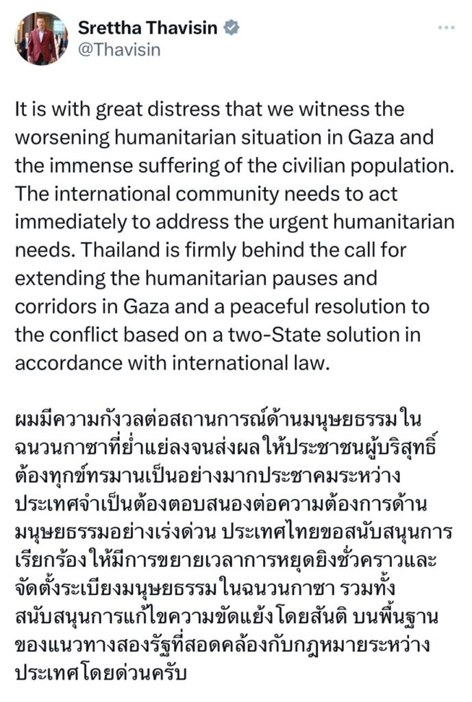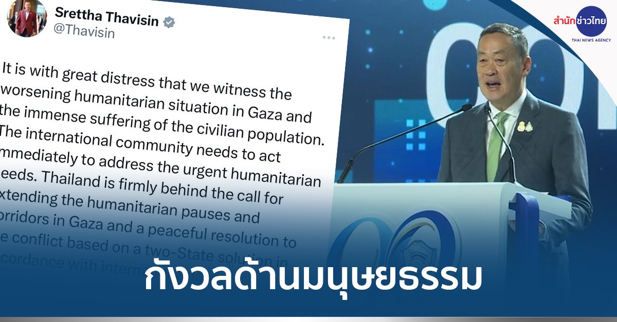 ผู้สื่อข่าวรายงานว่า นายเศรษฐา ทวีสิน นายกรัฐมนตรี และรมว.คลัง โพสต์ข้อความผ่าน X ระบุว่า ผมมีความกังวลต่อสถานการณ์ด้านมนุษยธรรมในฉนวนกาซาที่ย่ำแย่ลง จนส่งผลให้ประชาชนผู้บริสุทธิ์ต้องทุกข์ทรมานเป็นอย่างมาก ประชาคมระหว่างประเทศจำเป็นต้องตอบสนองต่อความต้องการด้านมนุษยธรรมอย่างเร่งด่วน ประเทศไทยขอสนับสนุนการเรียกร้องให้มีการขยายเวลาการหยุดยิงชั่วคราวและจัดตั้งระเบียงมนุษยธรรมในฉนวนกาซา รวมทั้งสนับสนุนการแก้ไขความขัดแย้งโดยสันติ บนพื้นฐานของแนวทางสองรัฐที่สอดคล้องกับกฎหมายระหว่างประเทศโดยด่วนครับ .-สำนักข่าวไทย