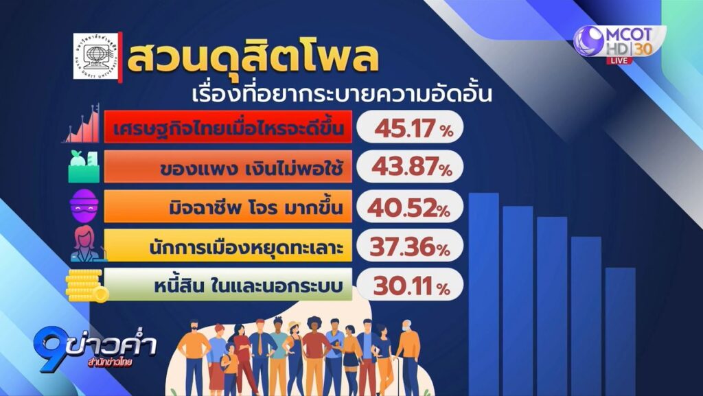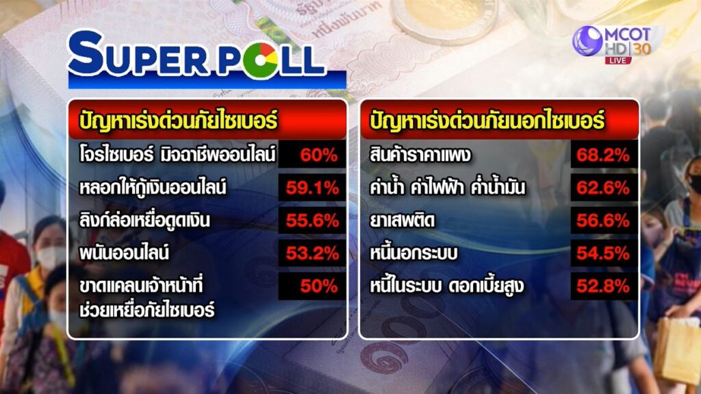 กรุงเทพฯ 19 พ.ย. – ซูเปอร์โพล เผยแพร่ผลสำรวจความคิดเห็น “โอกาสรัฐบาลกับภัยไซเบอร์” พบปัญหาอยากให้แก่เร่งด่วน คือ มิจฉาชีพออนไลน์ ด้านสวนดุสิตโพล เผยผลสำรวจเรื่องที่พึ่งของคนไทย ณ วันนี้