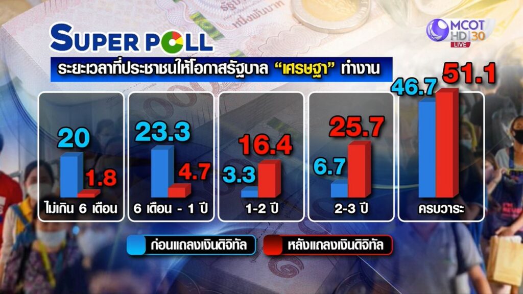 เมื่อถามถึงระยะเวลาที่ประชาชนให้โอกาสรัฐบาลทำงาน พบว่าประชาชนให้โอกาสรัฐบาลภายใต้การนำของนายเศรษฐา ทวีสิน ทำงานเพิ่มขึ้นในทุกกรอบเวลาจนครบวาระ นั่นเป็นเพราะฐานะทางการเงินของประชาชนจำนวนมากแย่ลง และประสบภัยทางไซเบอร์กลายเป็นปัญหารุนแรงเดือดร้อนมากกว่า เบียดแซงปัญหายาเสพติดและหนี้นอกระบบ เพราะปัญหาภัยไซเบอร์เข้าถึงมือประชาชนเกือบทั้งประเทศ เป็น ภัยอยู่กับมือ ของประชาชน