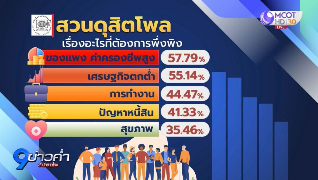 เรื่องที่ต้องการที่พึ่งมากที่สุดคือเรื่องของแพง ค่าครองชีพสูง ร้อยละ 57.79 รองลงมาคือ สภาพเศรษฐกิจตกต่ำ ร้อยละ 55.14 และตามมาด้วยการทำงาน ร้อยละ 44.47 ปัญหาหนี้สิน ร้อยละ 41.33