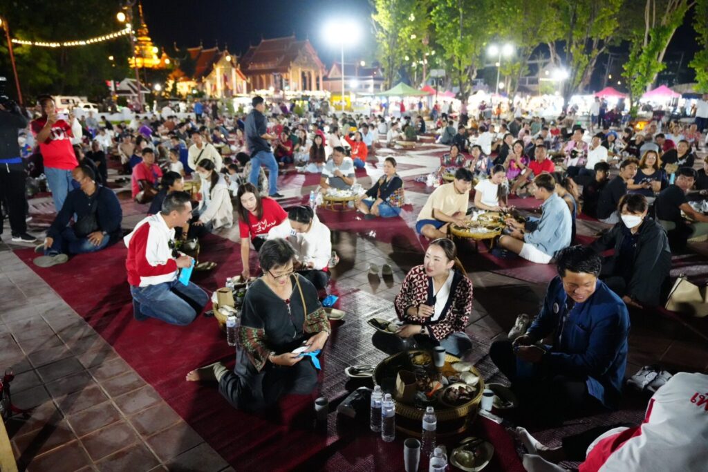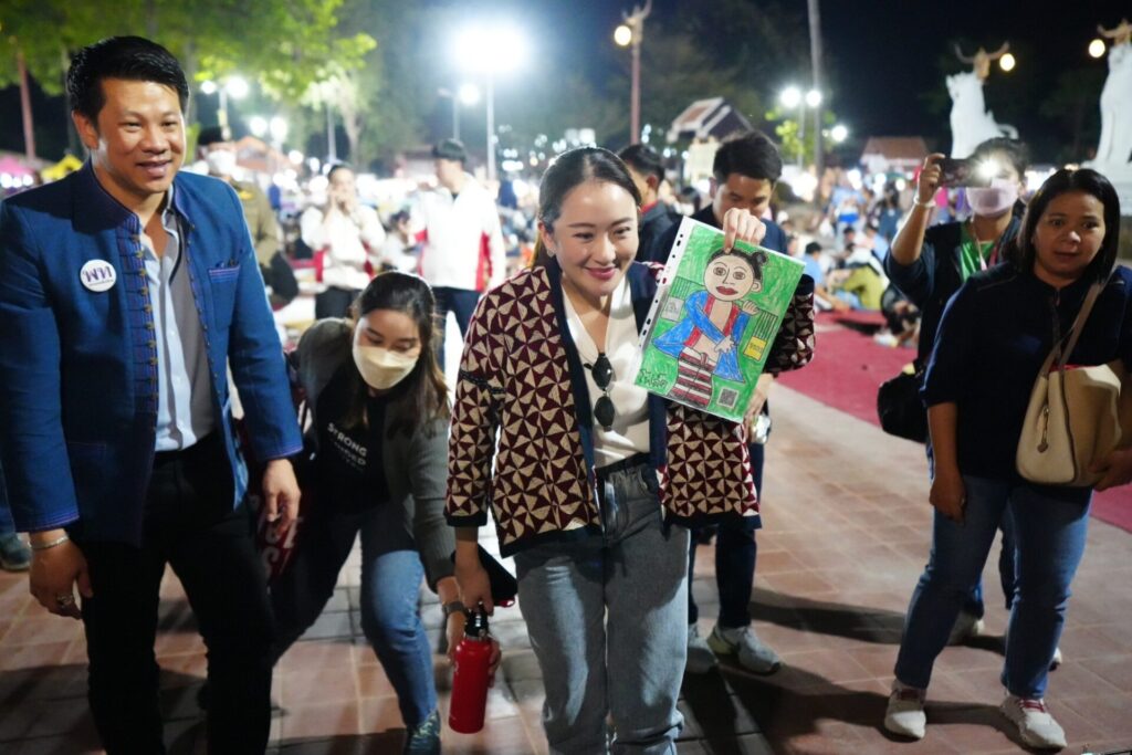 จากนั้นนางสาวแพทองธารลงพื้นที่ตลาดกลางเวียง อ.เวียงสา และถนนคนเดินกาดข่วงเมืองน่าน หน้าวัดภูมินทร์ อ.เมือง สำรวจการค้าขายและการท่องเที่ยว ที่โดยมี สส.พรรคเพื่อไทย จ.น่าน ให้การต้อนรับ ซึ่งนางสาวแพทองธารได้อุดหนุนสินค้า OTOP ของดีเมืองน่าน พูดคุยกับพ่อค้าแม่ขาย ก่อนจะร่วมรับประทานอาหารเย็นแบบขันโตก บริเวณลานข่วงเมืองน่าน ร่วมกับนักท่องเที่ยวและพี่น้องประชาชนที่มาจับจ่ายใช้สอย รวมถึงได้อุดหนุนภาพวาดที่วาดโดยผู้ป่วยออทิสติก จำนวน 4 ภาพ และอุดหนุนผ้าสไบพื้นเมืองน่าน ที่กลุ่มสตรีเมืองน่านนำงบประมาณที่ได้จากกองทุนพัฒนาบทบาทสตรี ในสมัยรัฐบาลยิ่งลักษณ์ ชินวัตร มาผลิตและจัดจำหน่าย เพื่อนำรายได้มาต่อยอดในการทำกิจกรรมต่างๆ โดยประชาชนและนักท่องเที่ยวได้เข้ามาให้กำลังใจและขอถ่ายรูปร่วมกับนางสาวแพรทองธารโดยตลอด.-สำนักข่าวไทย