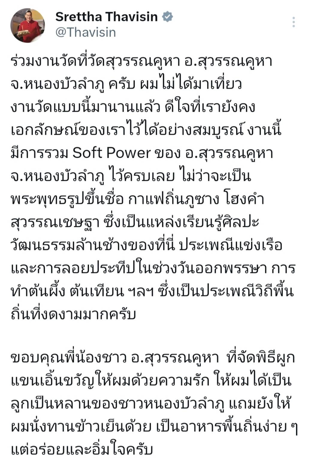 นายเศรษฐา ทวีสิน นายกรัฐมนตรีและรัฐมนตรีว่าการกระทรวงการคลัง หลังร่วมงานวัดสุวรรณคูหา อ.สุวรรณคูหา จ.หนองบัวลำภู ได้ทวีตผ่านแอปพลิเคชัน X ชื่อ Srettha Thavisin ว่า “ผมไม่ได้มาเที่ยวงานวัดแบบนี้มานานแล้ว ดีใจที่เรายังคงเอกลักษณ์ของเราไว้ได้อย่างสมบูรณ์ งานนี้มีการรวม Soft Power ของ อ.สุวรรณคูหา จ.หนองบัวลำภู ไว้ครบเลย ไม่ว่าจะเป็นพระพุทธรูปขึ้นชื่อ กาแฟถิ่นภูซาง โฮงคำสุวรรณเชษฐา ซึ่งเป็นแหล่งเรียนรู้ศิลปะ วัฒนธรรมล้านช้างของที่นี่ ประเพณีแข่งเรือ และการลอยประทีปในช่วงวันออกพรรษา การทำต้นผึ้ง ต้นเทียน ฯลฯ ซึ่งเป็นประเพณีวิถีพื้นถิ่นที่งดงามมากครับ
