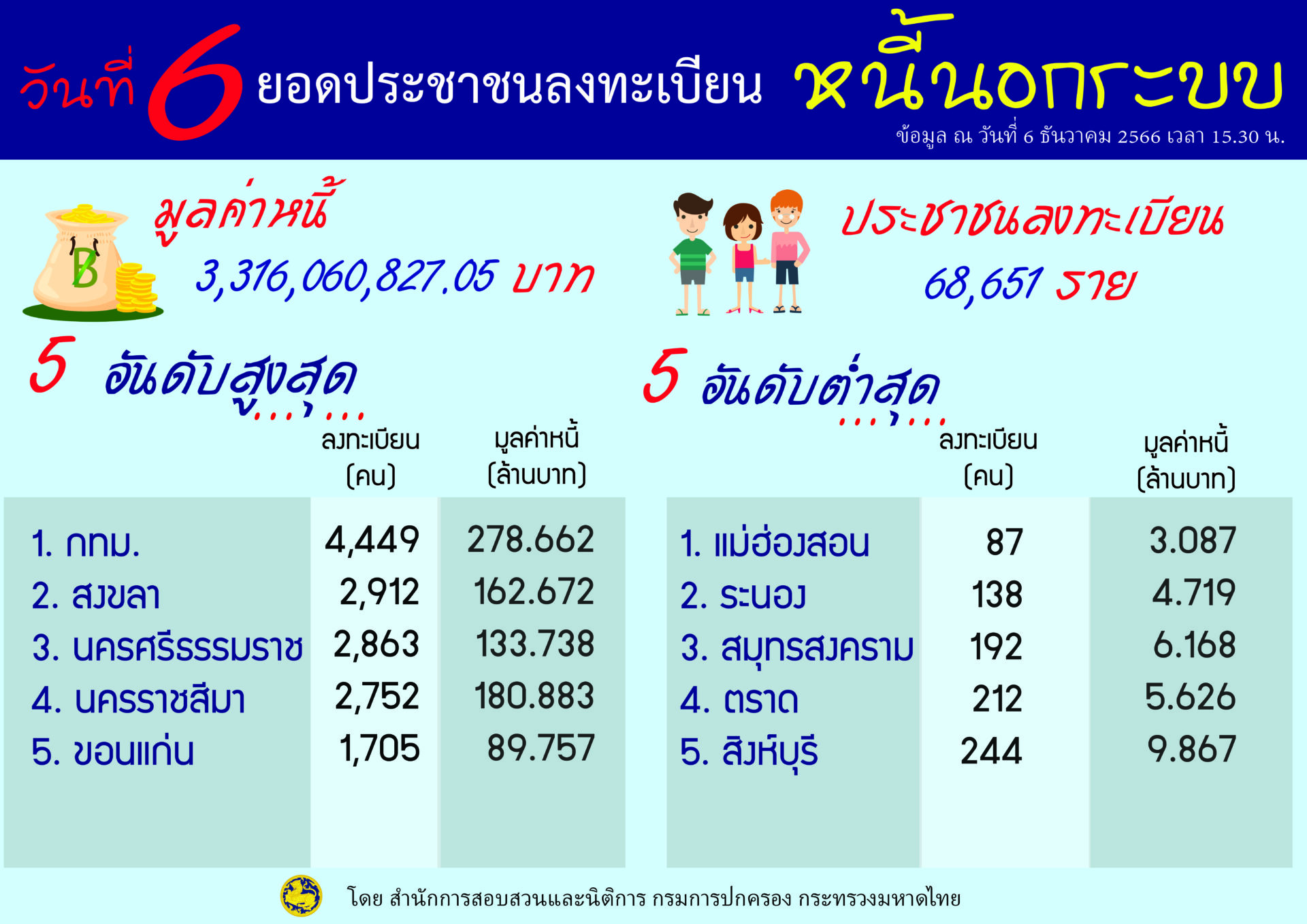 กรุงเทพฯ 6 ธ.ค. – ปลัดมหาดไทย เผยลงทะเบียนหนี้นอกระบบ วันที่ 6 ยอดมูลหนี้พุ่งรวม 3.3 พันล้านบาท ประชาชนลงทะเบียนแล้ว 68,651 ราย กทม.ยังคงครองแชมป์ 4,449 ราย ขอนแก่นพุ่งทะยานติดอันดับที่ 5 แม่ฮ่องสอนยึดเก้าอี้หนี้นอกระบบต่ำสุด 87 ราย