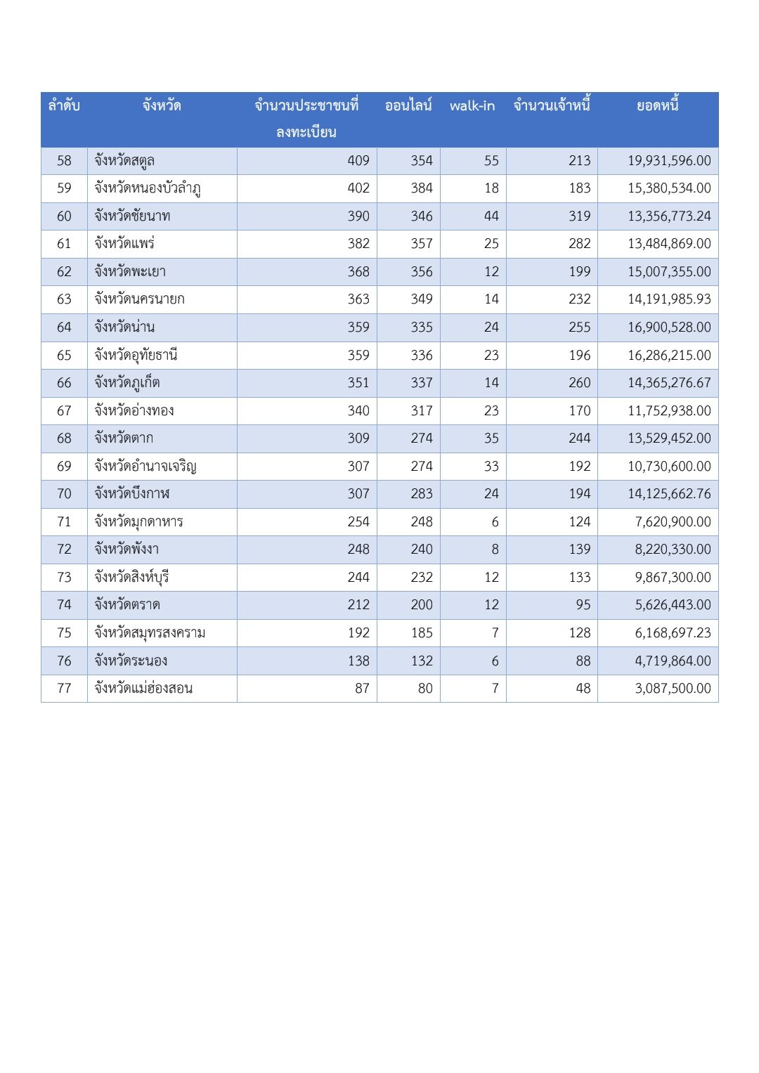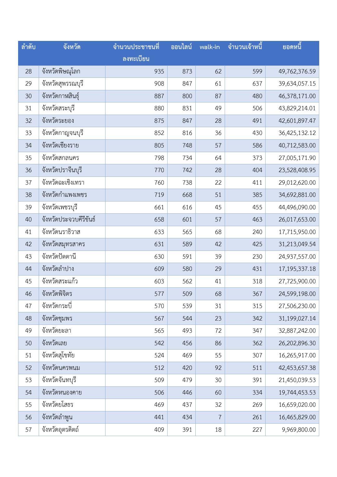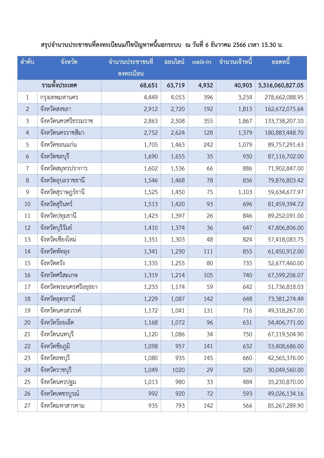 นายสุทธิพงษ์ จุลเจริญ ปลัดกระทรวงมหาดไทย เปิดเผยว่า วันนี้ (6 ธ.ค.66) เป็นวันที่ 6 ของการเปิดรับลงทะเบียนแก้ไขปัญหาหนี้นอกระบบ โดยจากข้อมูลของสำนักการสอบสวนและนิติการ กรมการปกครอง เมื่อเวลา 15.30 น. พบว่า มีประชาชนลงทะเบียนแก้ไขปัญหาหนี้นอกระบบ รวมทั้งสิ้นจำนวน 68,651 ราย แบ่งเป็นการลงทะเบียนผ่านระบบออนไลน์ 63,719 ราย และการลงทะเบียน ณ ศูนย์อำนวยการแก้ไขหนี้นอกระบบ 4,932 ราย รวมจำนวนเจ้าหนี้ 40,903 ราย มีมูลหนี้รวม 3,316.060 ล้านบาท โดยมีพื้นที่/จังหวัด 5 ลำดับแรก คือ 1. กรุงเทพมหานคร มีผู้ลงทะเบียน 4,449 ราย เจ้าหนี้ 3,234 ราย มูลหนี้ 278.662 ล้านบาท 2. สงขลา มีผู้ลงทะเบียน 2,912 ราย เจ้าหนี้ 1,813 ราย มูลหนี้ 162.672 ล้านบาท 3. นครศรีธรรมราช มีผู้ลงทะเบียน 2,863 ราย เจ้าหนี้ 1,867 ราย มูลหนี้ 133.738 ล้านบาท 4. นครราชสีมา มีผู้ลงทะเบียน 2,752 ราย เจ้าหนี้ 1,379 ราย มูลหนี้ 180.883 ล้านบาท 5. ขอนแก่น มีผู้ลงทะเบียน 1,705 ราย เจ้าหนี้ 1,079 ราย มูลหนี้ 89.757 ล้านบาท โดย จ.ขอนแก่น ขยับมาติดใน 5 อันดับเป็นวันแรก และในส่วนของจังหวัดที่มีผู้ลงทะเบียนน้อยที่สุด 5 ลำดับแรก ได้แก่ 1. แม่ฮ่องสอน มีผู้ลงทะเบียน 87 ราย เจ้าหนี้ 48 ราย มูลหนี้ 3.087 ล้านบาท 2. ระนอง มีผู้ลงทะเบียน 138 ราย เจ้าหนี้ 88 ราย มูลหนี้ 4.719 ล้านบาท 3. สมุทรสงคราม มีผู้ลงทะเบียน 192 ราย เจ้าหนี้ 128 ราย มูลหนี้ 6.168 ล้านบาท 4. ตราด มีผู้ลงทะเบียน 212 ราย เจ้าหนี้ 95 ราย มูลหนี้ 5.626 ล้านบาท และ 5. สิงห์บุรี มีผู้ลงทะเบียน 244 ราย เจ้าหนี้ 133 ราย มูลหนี้ 9.867 ล้านบาท