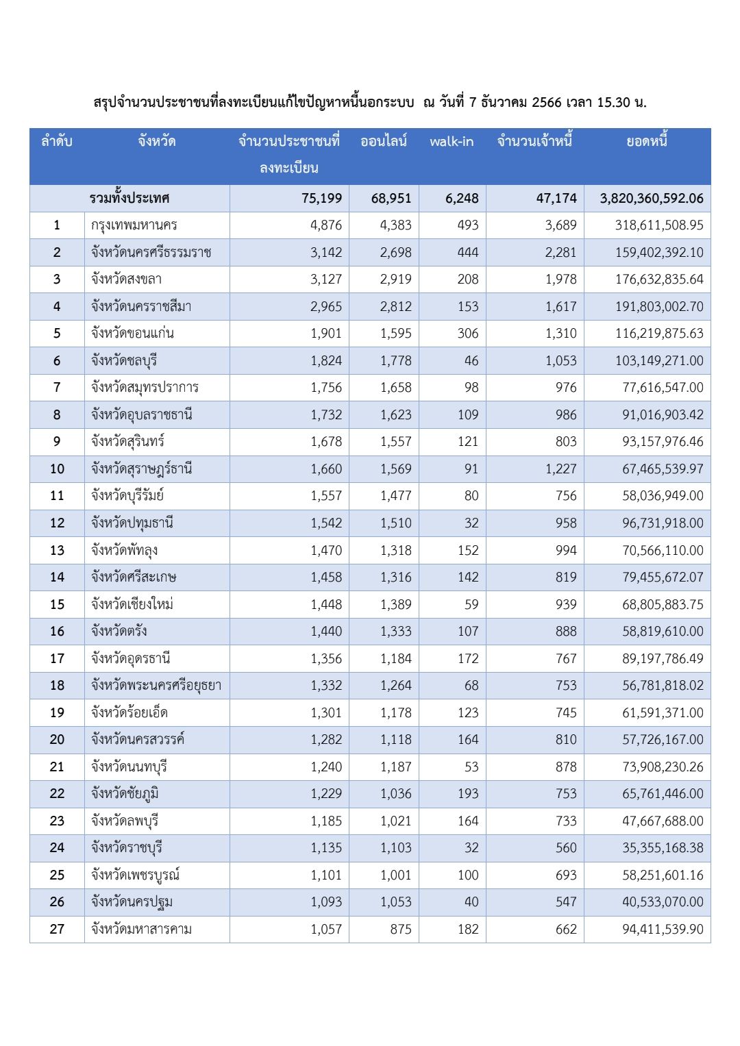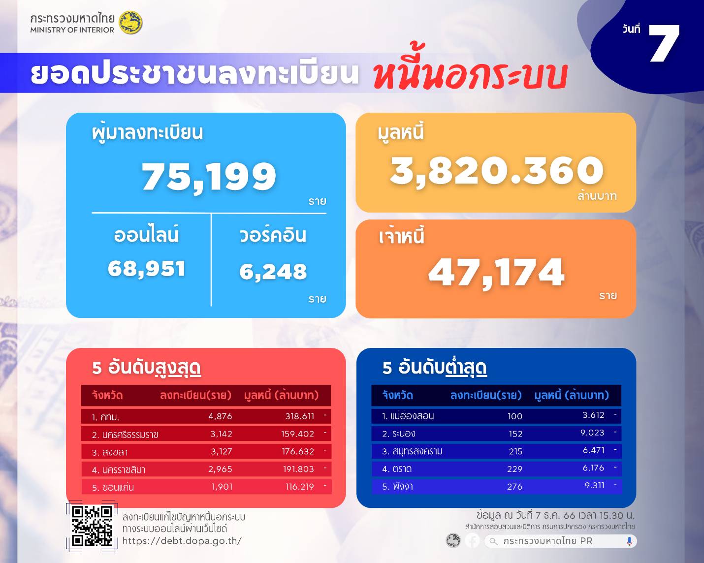 กรุงเทพฯ 7 ธ.ค. – ปลัดมหาดไทย เผยผลลงทะเบียนหนี้นอกระบบครบ 1 สัปดาห์ มูลหนี้พุ่ง 3.8 พันล้านบาท ประชาชนลงทะเบียนแล้ว 7.5 หมื่นราย กทม.-นครศรีฯ-สงขลา-โคราช-ขอนแก่น ยังคงทะยาน 5 อันดับแรก