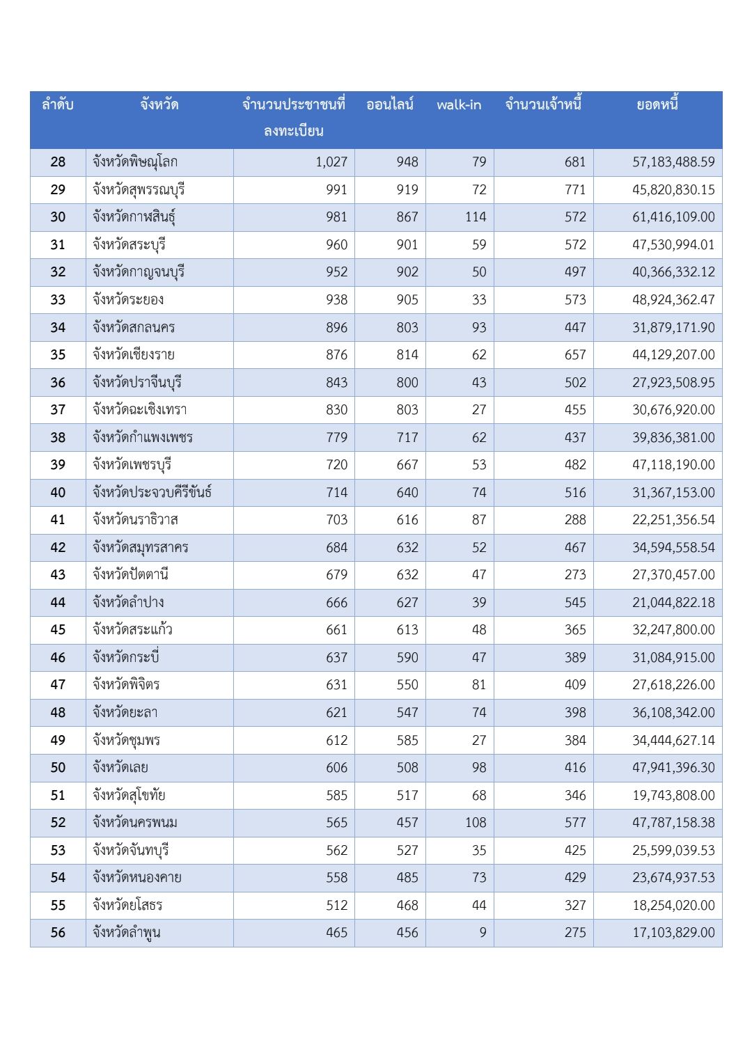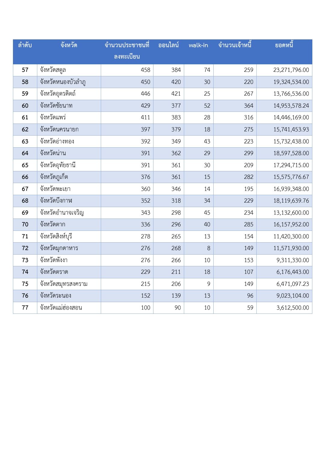 นายสุทธิพงษ์ จุลเจริญ ปลัดกระทรวงมหาดไทย เปิดเผยถึงการเปิดรับลงทะเบียนแก้ไขปัญหาหนี้นอกระบบ เป็นวันที่ 7 ครบ 1 สัปดาห์ โดยจากข้อมูลของสำนักการสอบสวนและนิติการ กรมการปกครอง เมื่อเวลา 15.30 น. พบว่า มีประชาชนลงทะเบียนแก้ไขปัญหาหนี้นอกระบบ รวมทั้งสิ้นจำนวน 75,199 ราย แบ่งเป็นการลงทะเบียนผ่านระบบออนไลน์ 68,951 ราย และการลงทะเบียน ณ ศูนย์อำนวยการแก้ไขหนี้นอกระบบ 6,248 ราย รวมจำนวนเจ้าหนี้ 47,174 ราย มีมูลหนี้รวม 3,820.36 ล้านบาท โดยมีพื้นที่/จังหวัด 5 ลำดับแรก คือ 1. กรุงเทพมหานคร มีผู้ลงทะเบียน 4,876 ราย เจ้าหนี้ 3,689 ราย มูลหนี้ 318.611 ล้านบาท 2. นครศรีธรรมราช มีผู้ลงทะเบียน 3,142 ราย เจ้าหนี้ 2,281 ราย มูลหนี้ 159.402 ล้านบาท 3. สงขลา มีผู้ลงทะเบียน 3,127 ราย เจ้าหนี้ 1,978 ราย มูลหนี้ 176.632 ล้านบาท 4. นครราชสีมา มีผู้ลงทะเบียน 2,965 ราย เจ้าหนี้ 1,617 ราย มูลหนี้ 191.803 ล้านบาท 5. ขอนแก่น มีผู้ลงทะเบียน 1,901 ราย เจ้าหนี้ 1,310 ราย มูลหนี้ 116.219 ล้านบาท ขณะที่จังหวัดที่มีผู้ลงทะเบียนน้อยที่สุด 5 ลำดับแรก ได้แก่ 1. แม่ฮ่องสอน มีผู้ลงทะเบียน 100 ราย เจ้าหนี้ 59 ราย มูลหนี้ 3.612 ล้านบาท 2. ระนอง มีผู้ลงทะเบียน 152 ราย เจ้าหนี้ 96 ราย มูลหนี้ 9.023 ล้านบาท 3. สมุทรสงคราม มีผู้ลงทะเบียน 215 ราย เจ้าหนี้ 149 ราย มูลหนี้ 6.471 ล้านบาท 4. ตราด มีผู้ลงทะเบียน 229 ราย เจ้าหนี้ 107 ราย มูลหนี้ 6.176 ล้านบาท และ 5. พังงา มีผู้ลงทะเบียน 276 ราย เจ้าหนี้ 153 ราย มูลหนี้ 9.311 ล้านบาท