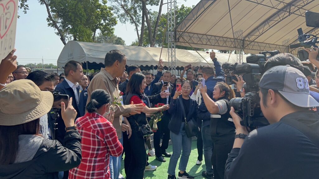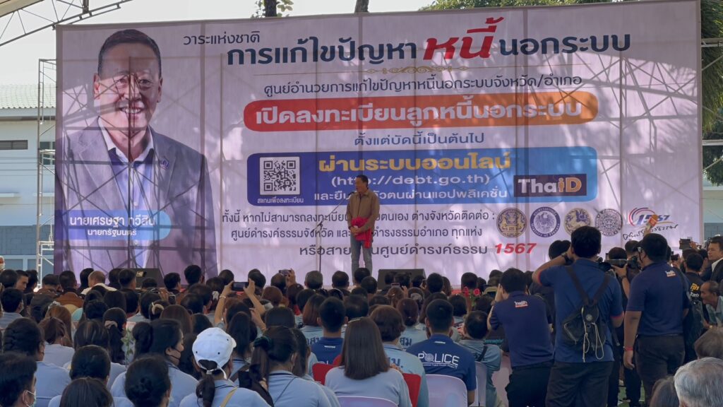 โดยนายกรัฐมนตรี ขึ้นเวทีกล่าวทักทาย ประชาชน ว่า นี่เป็นโอกาสดีหลังการเลือกตั้ง วันนี้ได้มาจังหวัดกาญจนบุรีอีกครั้ง ตลอดระยะเวลา3 เดือน ที่รัฐบาลได้เข้ามาบริหารงาน พบว่าบ้านเมืองมีปัญหาเยอะ แต่เรามีคณะรัฐมนตรี คณะทำงานที่พร้อมรับใช้ประชาชนอย่างเต็มที่สิ่งสะท้อนเสียงเรียกร้องเสียงวิงวอนจากประชาชน คือ ปัญหาหนี้สิน ปัญหายาเสพติด ปัญหาปากท้อง ปัญหาการเกษตร ปัญหาการค้าขายระหว่างพรหมแดน ซึ่งรัฐบาลไม่ได้นิ่งนอนใจ โดยการแก้ไขปัญหาหนี้สิน รัฐบาลได้ประกาศเป็นวาระแห่งชาติแล้ว วันนี้หนี้นอกระบบจะต้องหมดไป จะเป็นการทำงานร่วมกันอย่างบูรณาการมีการตั้งเป้าหมายอย่างชัดเจนระหว่างนายอำเภอกับผู้กำกับฯทุกจังหวัด ใครมีปัญหากับการทวงหนี้ ไม่ว่าจะเป็นแก๊งมอเตอร์ไซค์ เข้ามาทวงหนี้ให้เข้ามาแจ้ง ย้ำว่ารัฐบาลให้ความเป็นธรรมกับเจ้าหนี้และลูกหนี้ รัฐบาลไม่ยอมรับการรีดไถนี่อย่างไม่เป็นธรรม