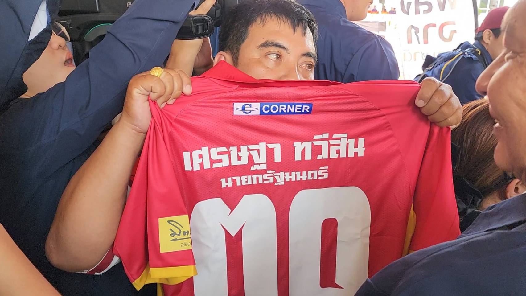 ทันทีที่นายกรัฐมนตรีเดินทางมาถึง ได้เดินชมสินค้าโอท็อปประจำจังหวัดกาญจนบุรี ซึ่งระหว่างนั้นได้มีประชาชนมอบเสื้อฟุตบอลสีแดง ของสโมสร DP Kanchanaburi FC หรือ Dragon FC ด้านหลังสกรีนชื่อ เศรษฐา ทวีสิน หมายเลข 30 โดยนายกรัฐมนตรีได้สอบถามว่า ขณะนี้สโมสรอยู่ในดิวิชันใด ประชาชนจึงตอบว่า ลีก 2 นายกฯ จึงอวยพรขอให้ขึ้นลีก 1 ในฤดูกาลหน้า