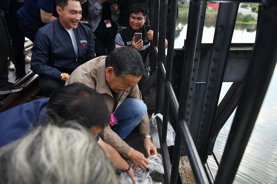 จากนั้นนายกรัฐมนตรี ได้ถ่ายรูปกลางสะพานแม่น้ำแคว ซึ่งถือเป็นสัญญลักษณ์ของจังหวัดกาญจนบุรี โดยระหว่างเดินไปยังกลางสะพานได้พบกับคุณยายที่ขายปลาปล่อยให้นักท่องเที่ยว ซึ่งจังหวะนี้เองคุณยายได้เดินหนี จากนั้นร.อ.ธรรมนัส พรหมเผ่า รัฐมนตรีว่าการกระทรวงเกษตรและสหกรณ์ นายอนุทิน ชาญวีรกูล รองนายกรัฐมนตรีและรัฐมนตรีว่าการกระทรวงมหาดไทย และนายกรัฐมนตรี ได้เรียกหาและเหมาปลาไหลของคุณยาย โดยทั้งนายกรัฐมนตรีและ ร.อ.ธรรมนัส ได้มอบเงินให้คุณยายคนละ 1,000 บาท ก่อนที่จะปล่อยปลาไหลกลางสะพาน