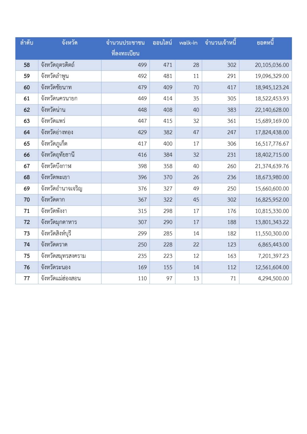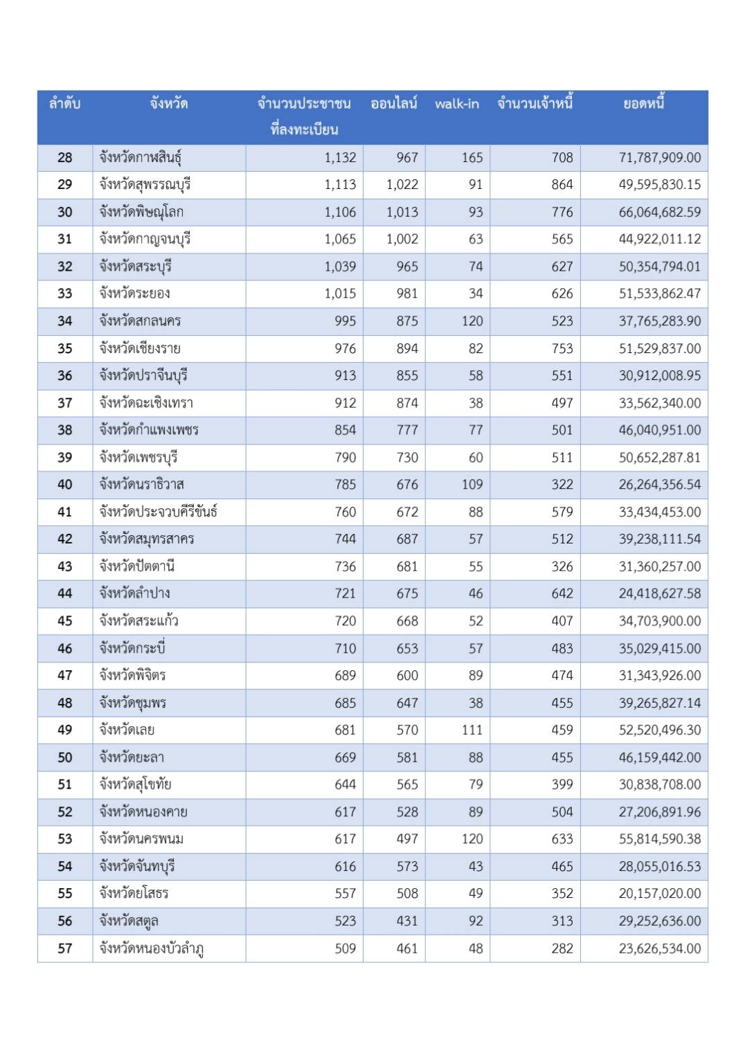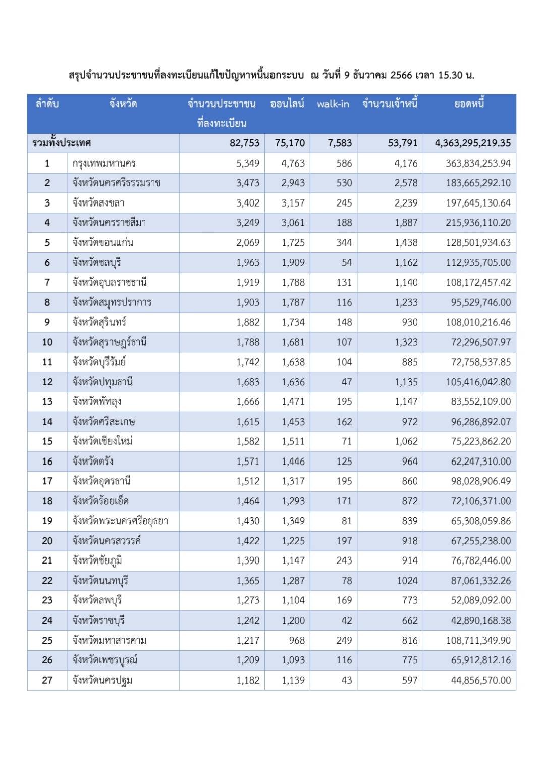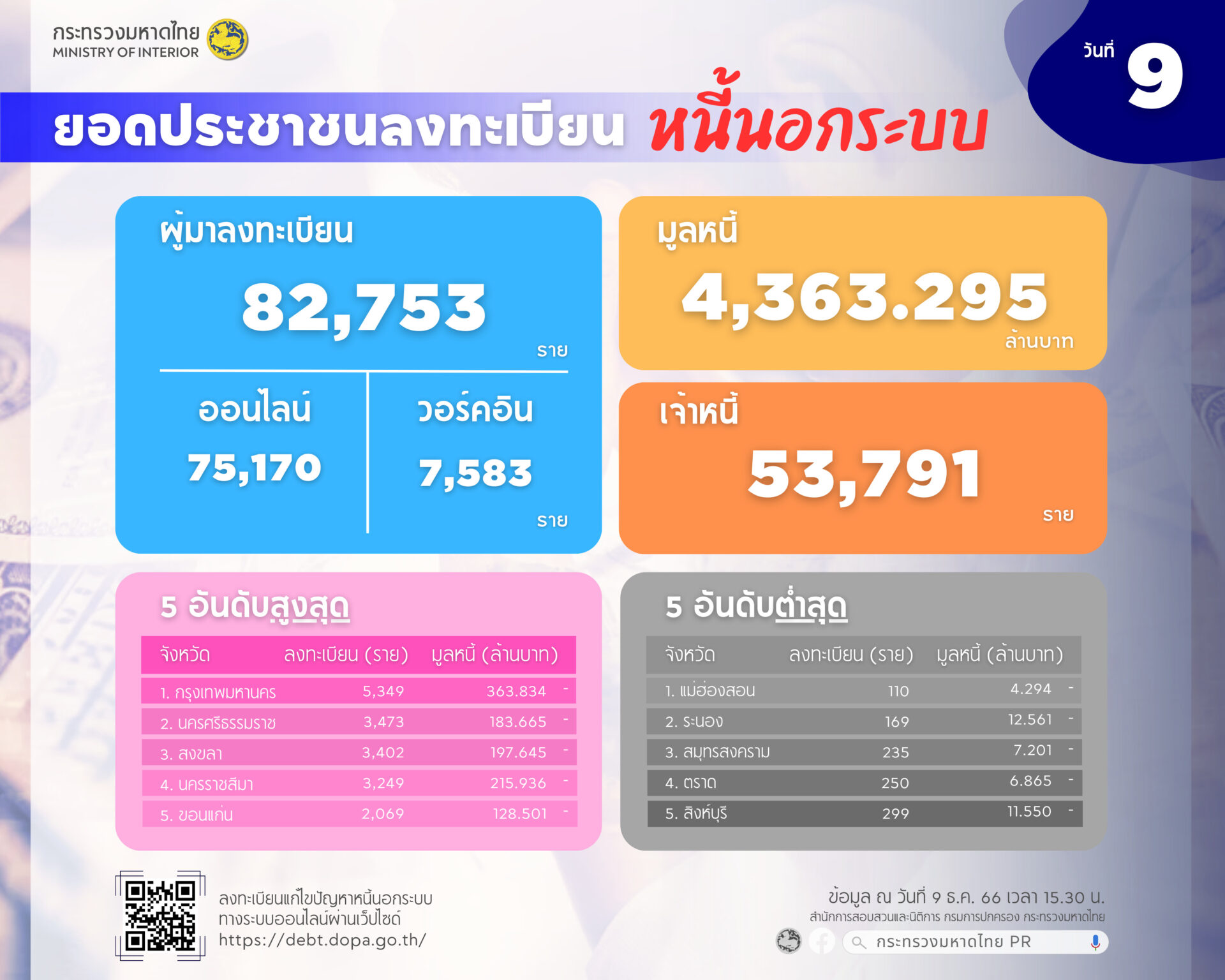 นายสุทธิพงษ์ จุลเจริญ ปลัดกระทรวงมหาดไทย กล่าวถึงการเปิดรับลงทะเบียนแก้ไขปัญหาหนี้นอกระบบ ซึ่งเข้าสู่สัปดาห์ที่ 2 ของการเปิดรับลงทะเบียน โดยในวันนี้ (9 ธ.ค.66) เป็นวันที่ 9 จากข้อมูลของสำนักการสอบสวนและนิติการ กรมการปกครอง เมื่อเวลา 15.30 น. พบว่า มีประชาชนลงทะเบียนรวมทั้งสิ้นจำนวน 82,753 ราย เพิ่มขึ้นจากวานนี้ 2,469 ราย แบ่งเป็นการลงทะเบียนผ่านระบบออนไลน์ 75,170 ราย และการลงทะเบียน ณ ศูนย์อำนวยการแก้ไขหนี้นอกระบบ 7,583 ราย รวมจำนวนเจ้าหนี้ 53,791 ราย มีมูลหนี้รวม 4,363.295 ล้านบาท โดยมีพื้นที่/จังหวัดที่มีผู้ลงทะเบียนมากที่สุด 5 ลำดับแรก ดังนี้ 1. กรุงเทพมหานคร ยังมากที่สุด มีผู้ลงทะเบียน 5,349 ราย เจ้าหนี้ 4,176 ราย มูลหนี้ 363.834 ล้านบาท ตามมาด้วย 2. นครศรีธรรมราช มีผู้ลงทะเบียน 3,473 ราย เจ้าหนี้ 2,578 ราย มูลหนี้ 183.665 ล้านบาท 3. สงขลา มีผู้ลงทะเบียน 3,402 ราย เจ้าหนี้ 2,239 ราย มูลหนี้ 197.645 ล้านบาท 4. นครราชสีมา มีผู้ลงทะเบียน 3,249 ราย เจ้าหนี้ 1,887 ราย มูลหนี้ 215.936 ล้านบาท 5. ขอนแก่น มีผู้ลงทะเบียน 2,069 ราย เจ้าหนี้ 1,438 ราย มูลหนี้ 128.501 ล้านบาท ขณะที่จังหวัดที่มีผู้ลงทะเบียนน้อยที่สุด 5 ลำดับแรก ได้แก่ 1. แม่ฮ่องสอน มีผู้ลงทะเบียน 110 ราย เจ้าหนี้ 71 ราย มูลหนี้ 4.294 ล้านบาท 2. ระนอง มีผู้ลงทะเบียน 169 ราย เจ้าหนี้ 112 ราย มูลหนี้ 12.561 ล้านบาท 3. สมุทรสงคราม มีผู้ลงทะเบียน 235 ราย เจ้าหนี้ 163 ราย มูลหนี้ 7.201 ล้านบาท 4. ตราด มีผู้ลงทะเบียน 250 ราย เจ้าหนี้ 123 ราย มูลหนี้ 6.865 ล้านบาท และ 5. สิงห์บุรี มีผู้ลงทะเบียน 299 ราย เจ้าหนี้ 182 ราย มูลหนี้ 11.550 ล้านบาท