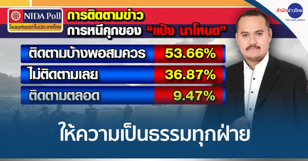 “นิด้าโพล” เปิดเผยผลสำรวจประชาชน เรื่อง “แป้ง นาโหนด กับกระบวนการยุติธรรมไทย” เมื่อถามประชาชนถึงการติดตามข่าวการหนีคุกของนายเชาวลิต ทองด้วง หรือ แป้ง นาโหนด พบว่า ตัวอย่างร้อยละ 53.66 ระบุว่า ติดตามบ้างพอสมควร รองลงมา ร้อยละ 36.87 ระบุว่า ไม่ติดตามเลย และร้อยละ 9.47 ระบุว่า ติดตามตลอด