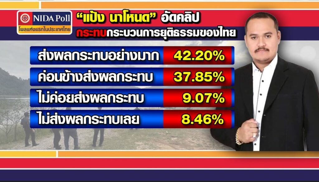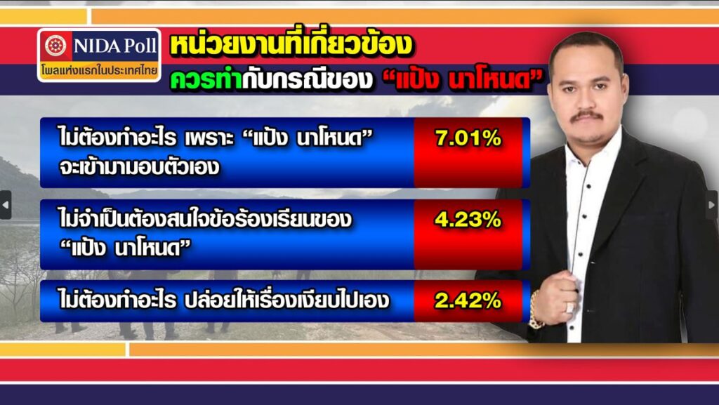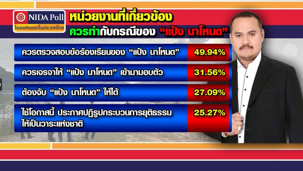 กรุงเทพฯ 10 ธ.ค. – นิด้าโพล เผยผลสำรวจประชาชน ชี้ “แป้ง นาโหนด” หนีคุก กระทบกระบวนการยุติธรรมของไทยอย่างมาก แนะหน่วยงานที่เกี่ยวข้องตรวจสอบข้อร้องเรียนของ “แป้ง นาโหนด” พร้อมทั้งให้ความเป็นธรรมกับทุกฝ่าย