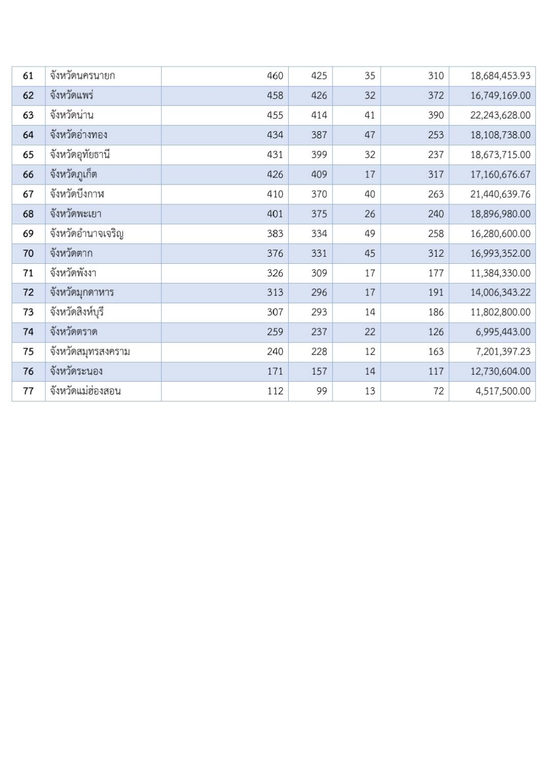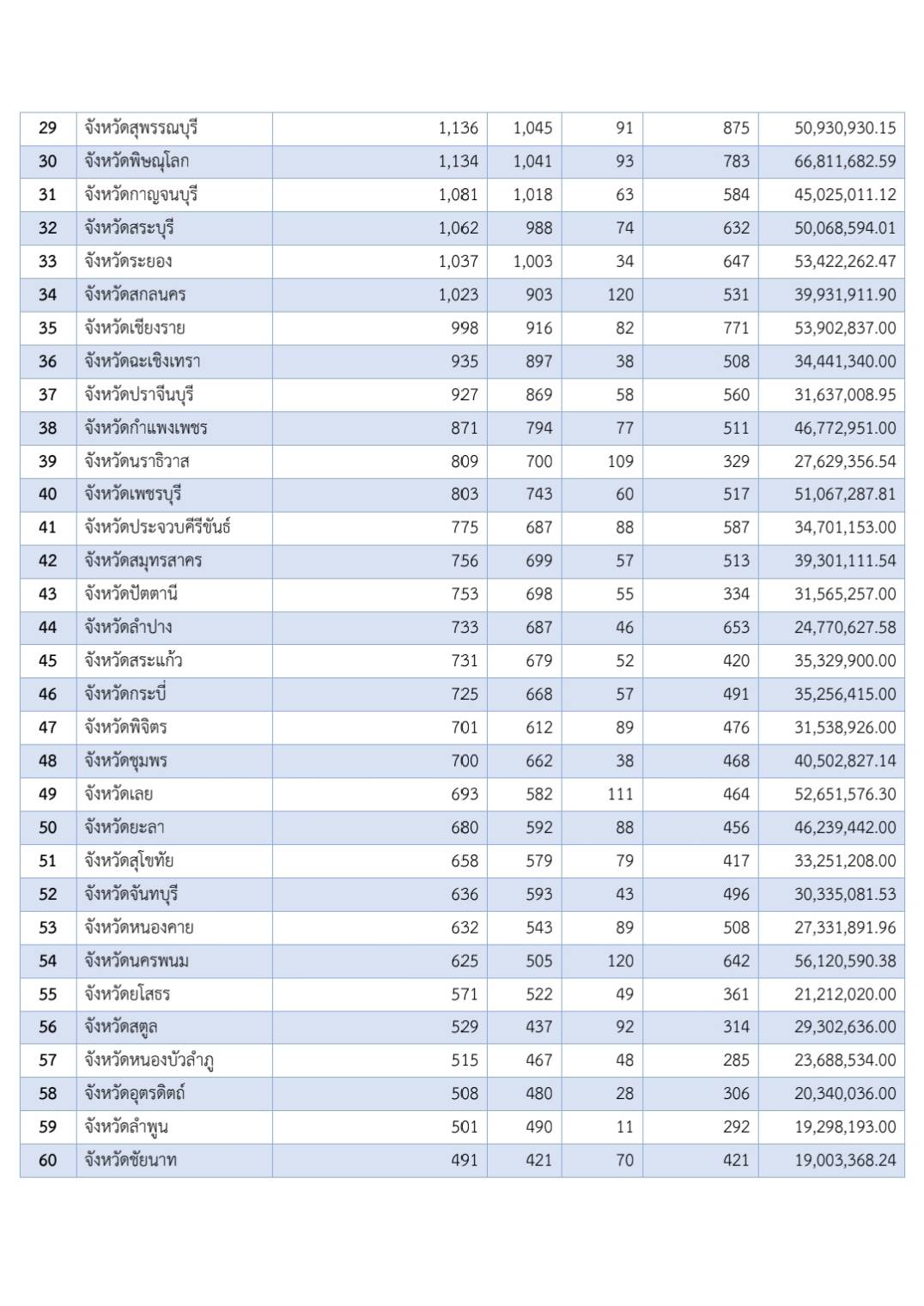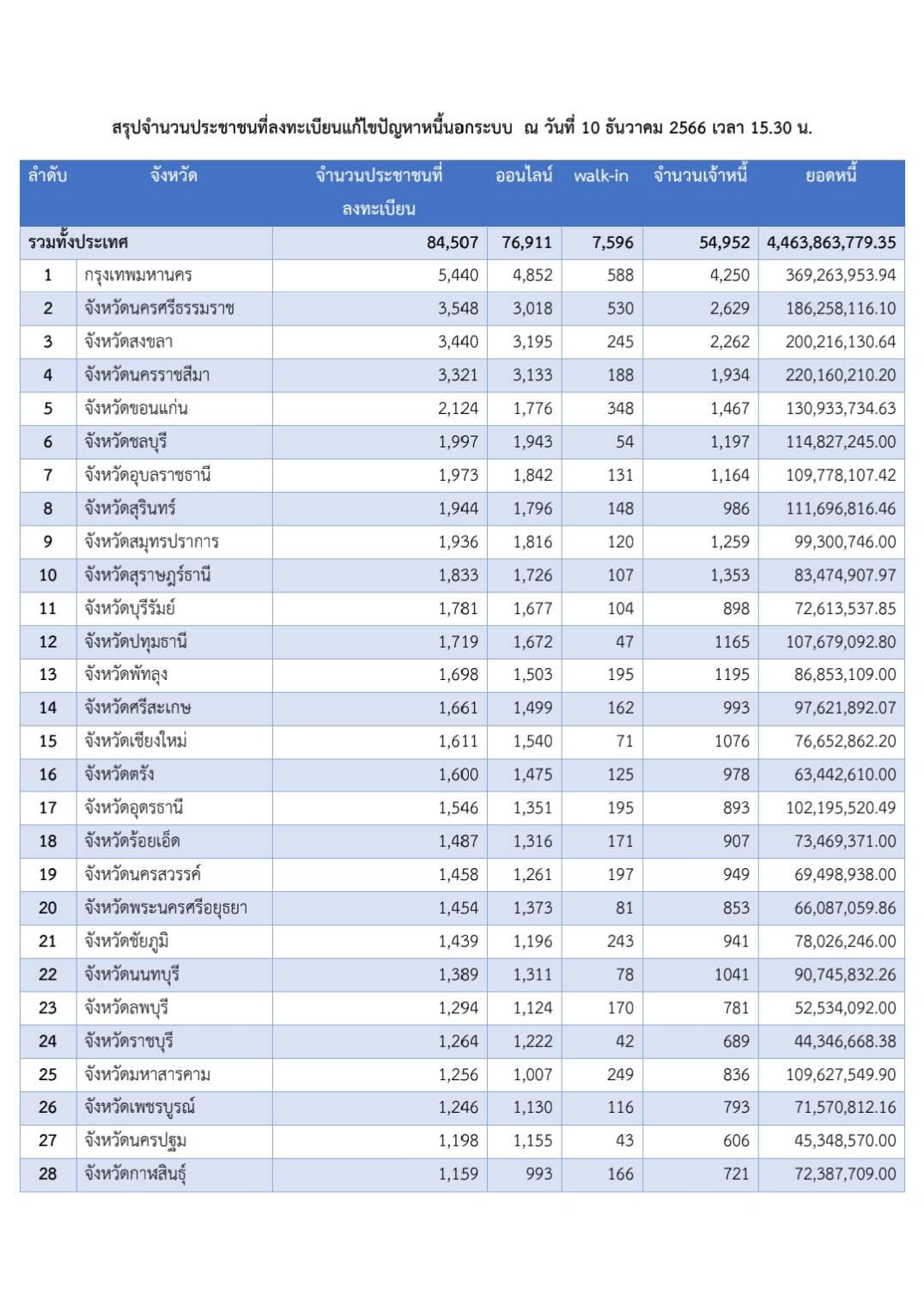 นายสุทธิพงษ์ จุลเจริญ ปลัดกระทรวงมหาดไทย กล่าวถึงการเปิดรับลงทะเบียนแก้ไขปัญหาหนี้นอกระบบ เข้าสู่วันที่ 10 ซึ่งจากข้อมูลของสำนักการสอบสวนและนิติการ กรมการปกครอง เมื่อเวลา 15.30 น. พบว่า มีประชาชนลงทะเบียนรวมทั้งสิ้น 84,507 ราย เพิ่มขึ้นจากวานนี้ 1,754 ราย แบ่งเป็นการลงทะเบียนผ่านระบบออนไลน์ 76,911 ราย และการลงทะเบียน ณ ศูนย์อำนวยการแก้ไขหนี้นอกระบบ 7,596 ราย รวมจำนวนเจ้าหนี้ 54,952 ราย มีมูลหนี้รวม 4,463.863 ล้านบาท โดยมีพื้นที่/จังหวัดที่มีผู้ลงทะเบียนมากที่สุด 5 ลำดับแรก ดังนี้ 1. กรุงเทพมหานคร ยังมากที่สุด มีผู้ลงทะเบียน 5,440 ราย เจ้าหนี้ 4,250 ราย มูลหนี้ 369.263 ล้านบาท ตามมาด้วย 2. นครศรีธรรมราช มีผู้ลงทะเบียน 3,548 ราย เจ้าหนี้ 2,629 ราย มูลหนี้ 186.258 ล้านบาท 3. สงขลา มีผู้ลงทะเบียน 3,440 ราย เจ้าหนี้ 2,262 ราย มูลหนี้ 200.216 ล้านบาท 4. นครราชสีมา มีผู้ลงทะเบียน 3,321 ราย เจ้าหนี้ 1,934 ราย มูลหนี้ 220.160 ล้านบาท 5. ขอนแก่น มีผู้ลงทะเบียน 2,124 ราย เจ้าหนี้ 1,467 ราย มูลหนี้ 130.933 ล้านบาท ขณะที่จังหวัดที่มีผู้ลงทะเบียนน้อยที่สุด 5 ลำดับแรก ได้แก่ 1. แม่ฮ่องสอน มีผู้ลงทะเบียน 112 ราย เจ้าหนี้ 72 ราย มูลหนี้ 4.517 ล้านบาท 2. ระนอง มีผู้ลงทะเบียน 171 ราย เจ้าหนี้ 117 ราย มูลหนี้ 12.730 ล้านบาท 3. สมุทรสงคราม มีผู้ลงทะเบียน 240 ราย เจ้าหนี้ 163 ราย มูลหนี้ 7.201 ล้านบาท 4. ตราด มีผู้ลงทะเบียน 259 ราย เจ้าหนี้ 126 ราย มูลหนี้ 6.995 ล้านบาท และ 5. สิงห์บุรี มีผู้ลงทะเบียน 307 ราย เจ้าหนี้ 186 ราย มูลหนี้ 11.802 ล้านบาท