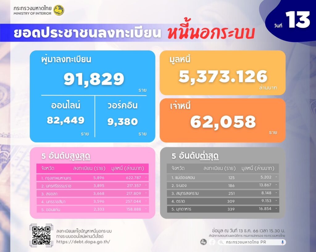 นายสุทธิพงษ์ จุลเจริญ ปลัดกระทรวงมหาดไทย เปิดเผยถึงการลงทะเบียนแก้ไขปัญหาหนี้นอกระบบ ซึ่งเป็นวันที่ 13 โดยจากข้อมูลของสำนักการสอบสวนและนิติการ กรมการปกครอง เมื่อเวลา 15.30 น. มีมูลหนี้รวม 5,373.126 ล้านบาท ประชาชนลงทะเบียนแล้ว 91,829 ราย โดยเป็นการลงทะเบียนผ่านระบบออนไลน์ 82,449 ราย และการลงทะเบียน ณ ศูนย์อำนวยการแก้ไขหนี้นอกระบบ 9,380 ราย รวมจำนวนเจ้าหนี้ 62,058 ราย