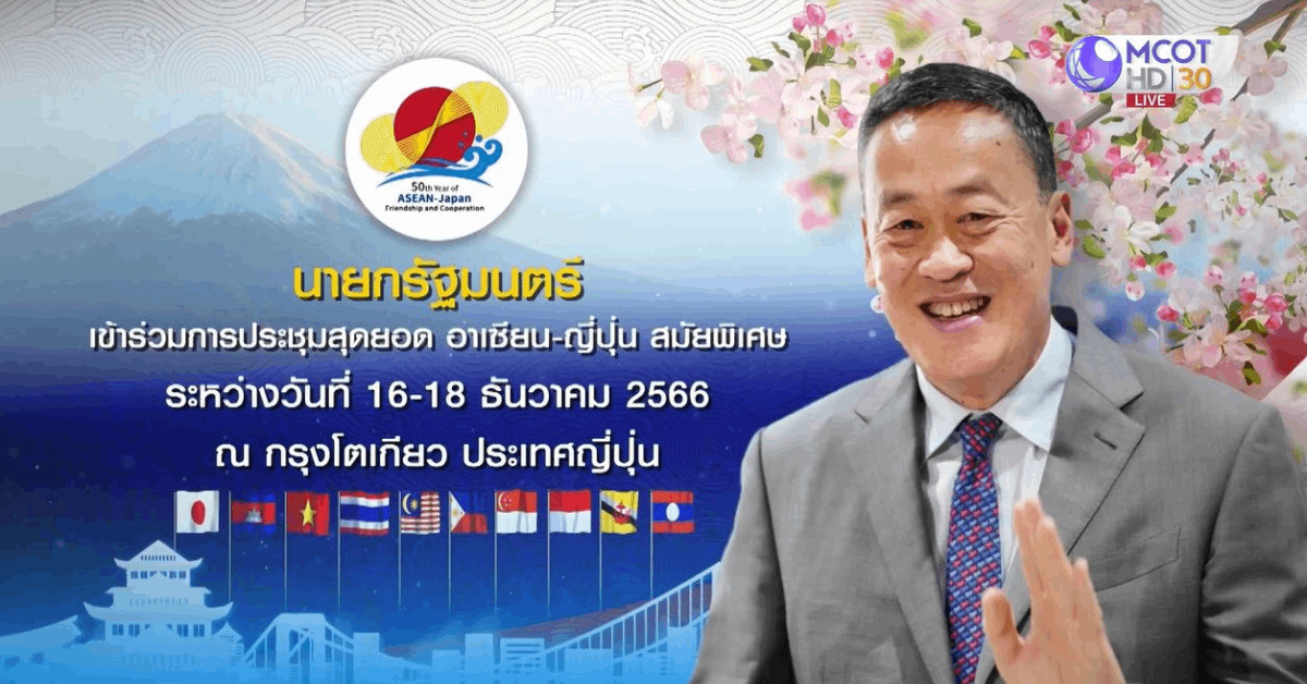 13 ธ.ค. – นายกรัฐมนตรี จะเดินทางเข้าร่วมประชุม สุดยอดอาเซียน-ญี่ปุ่น สมัยพิเศษ ในโอกาสฉลองครบรอบความสัมพันธ์ 50 ปี พร้อมผลักดัน วาระอาเซียน ด้านการค้า การลงทุน ทั้งเป็นตัวกลางประสานความขัดแย้งในภูมิภาค โทรทัศน์รวมการเฉพาะกิจแห่งประเทศไทยรายงาน .-สำนักข่าวไทย