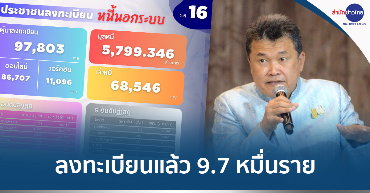 16 ธ.ค.- มหาดไทย เผยยอดลงทะเบียนหนี้นอกระบบครบ 16 วัน มูลหนี้ 5.7 พันล้านบาท ประชาชนลงทะเบียนแล้วกว่า 9.7 หมื่นราย เน้นย้ำ ฝ่ายปกครองทำงานเชิงรุก หากพบเจ้าหนี้มีพฤติกรรมข่มขู่คุกคามลูกหนี้ ต้องถูกดำเนินคดีตามกฎหมายไม่มีละเว้น